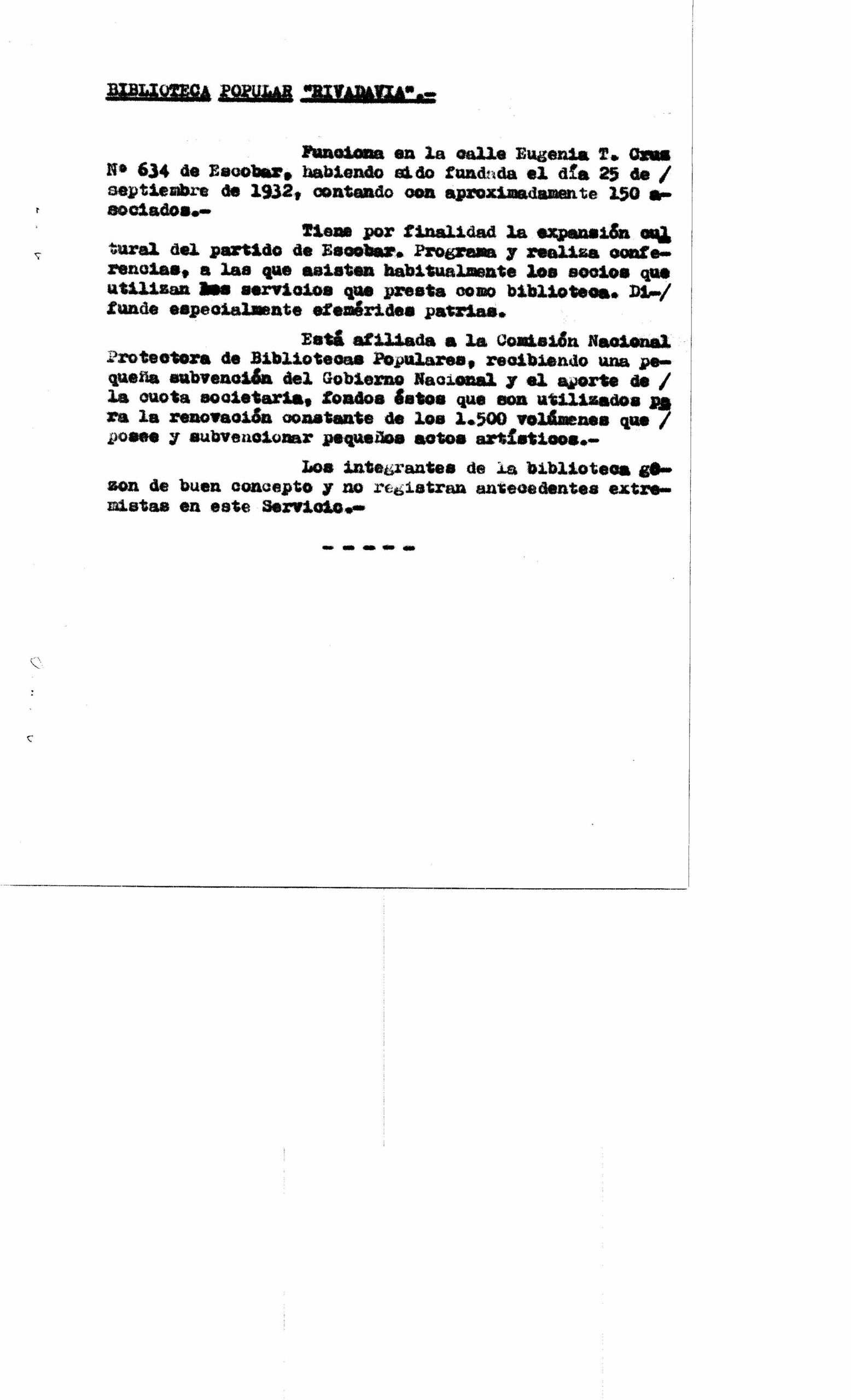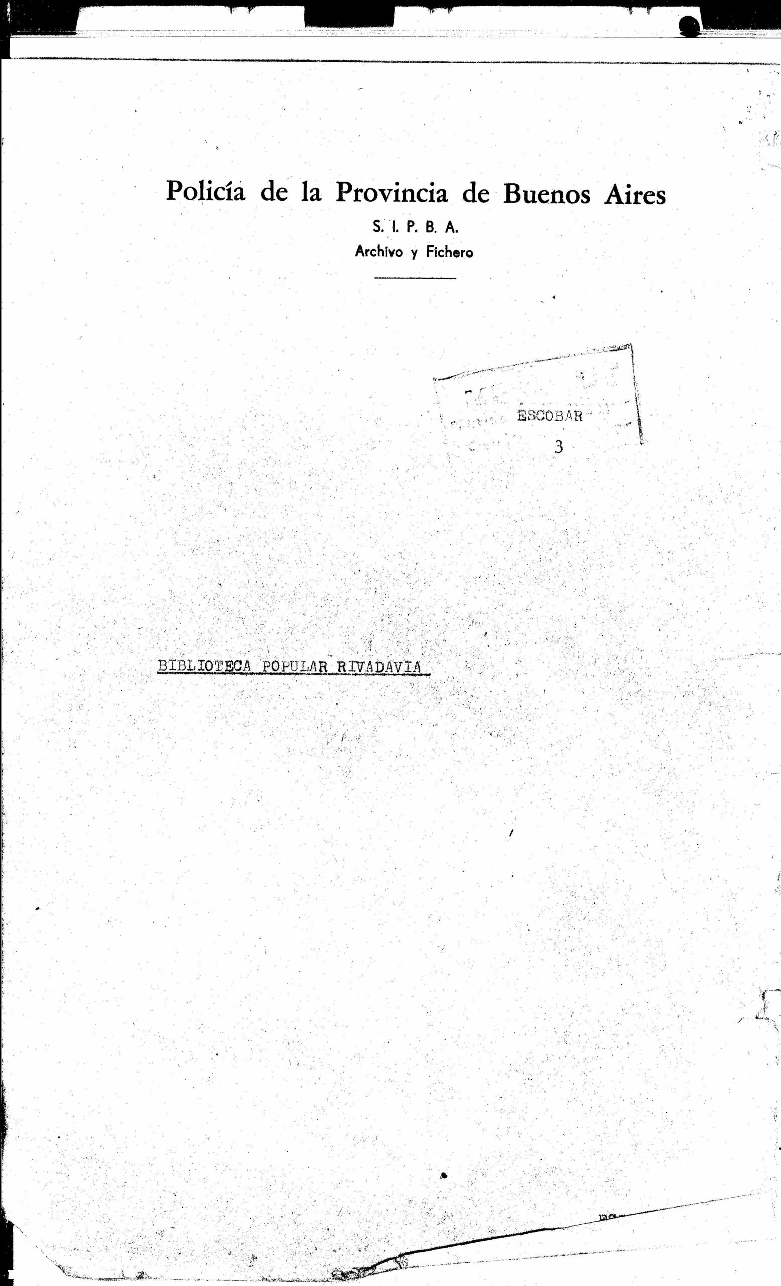 Carátula de legajo sobre la Biblioteca Popular Rivadavia. CPM- Fondo DIPPBA – Div. Cen. AyF, Mesa De, por localidades, legajo N° 3. Año 1967.