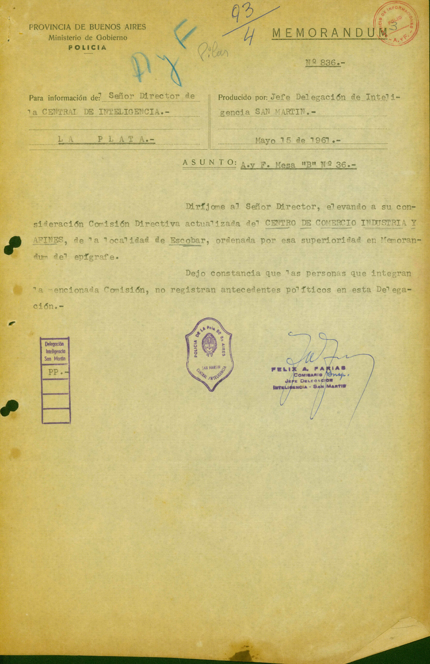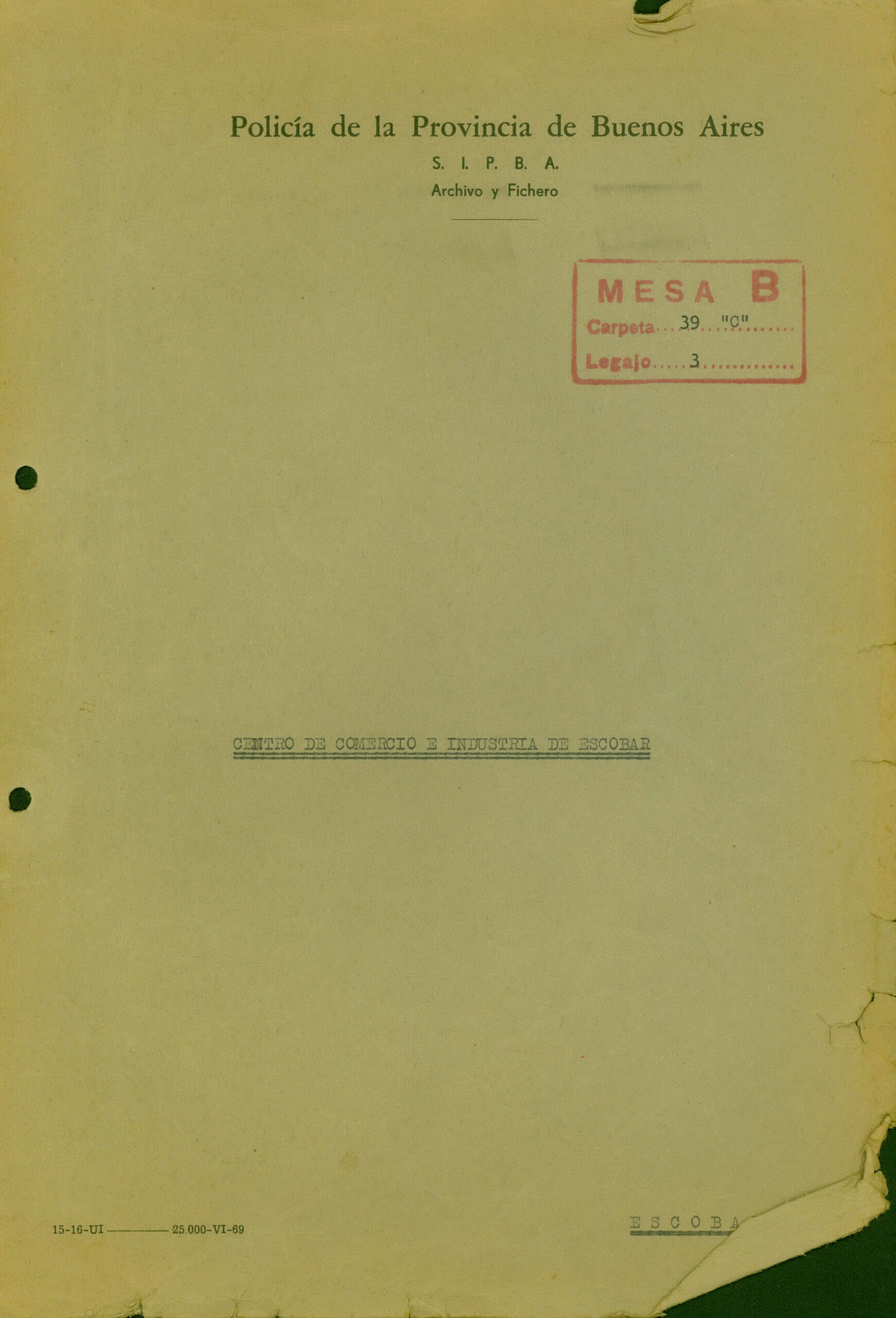 Carátula del legajo del Centro de comercio e industria de Escobar. CPM- Fondo DIPPBA- Div. Cen. AyF, Mesa B, carpeta 39c, legajo 3. Año 1961.