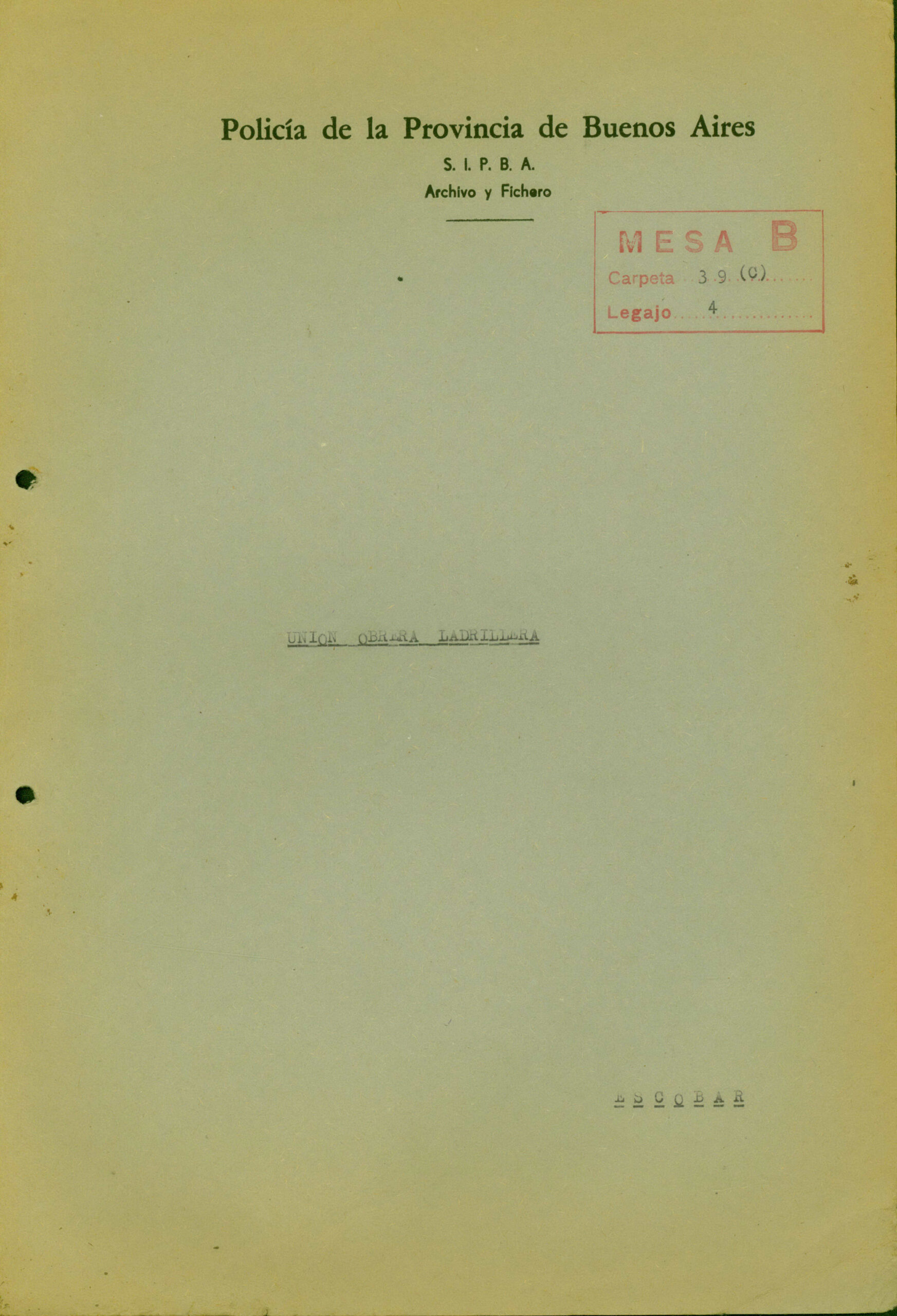 Carátula del legajo de la Unión Obrera Ladrillera. CPM- Fondo DIPPBA- Div. Cen. AyF, Mesa B, carpeta 39c, legajo 4. Año 1960.