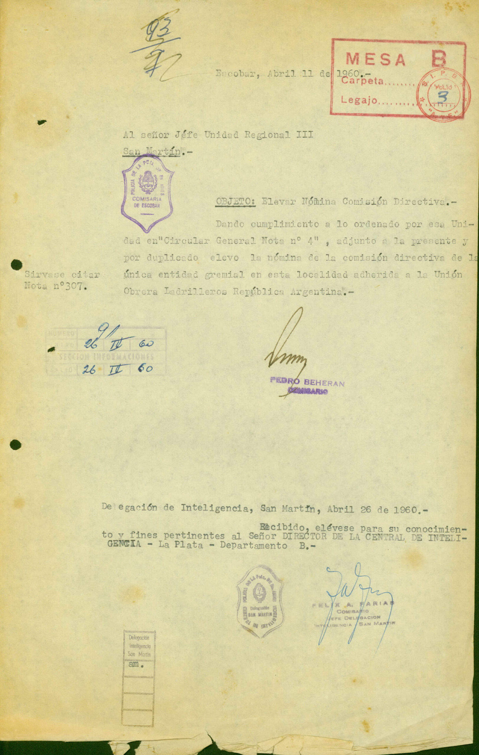 El legajo de seguimiento al sindicato de obreros y empleados municipales se encuentra en la Mesa B, y, además del registro de conflictos y actividades, contiene documentos relacionados con las elecciones gremiales.