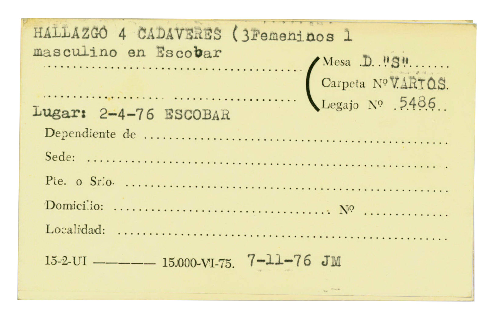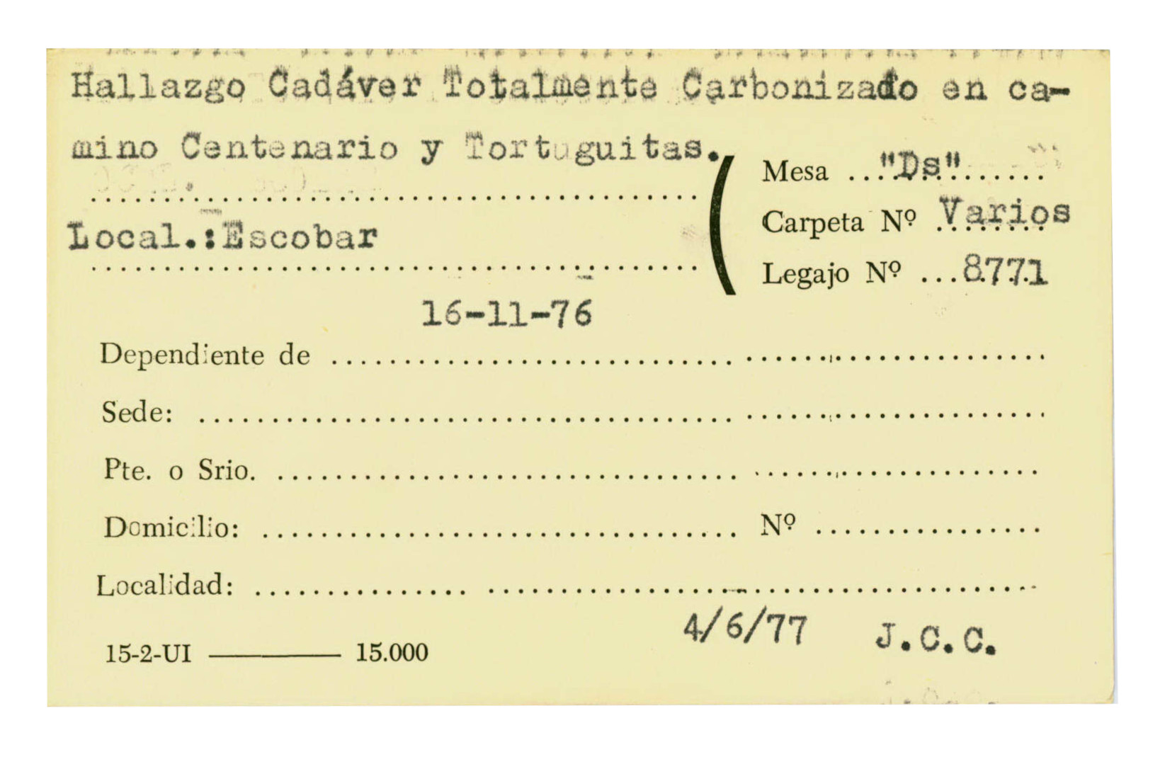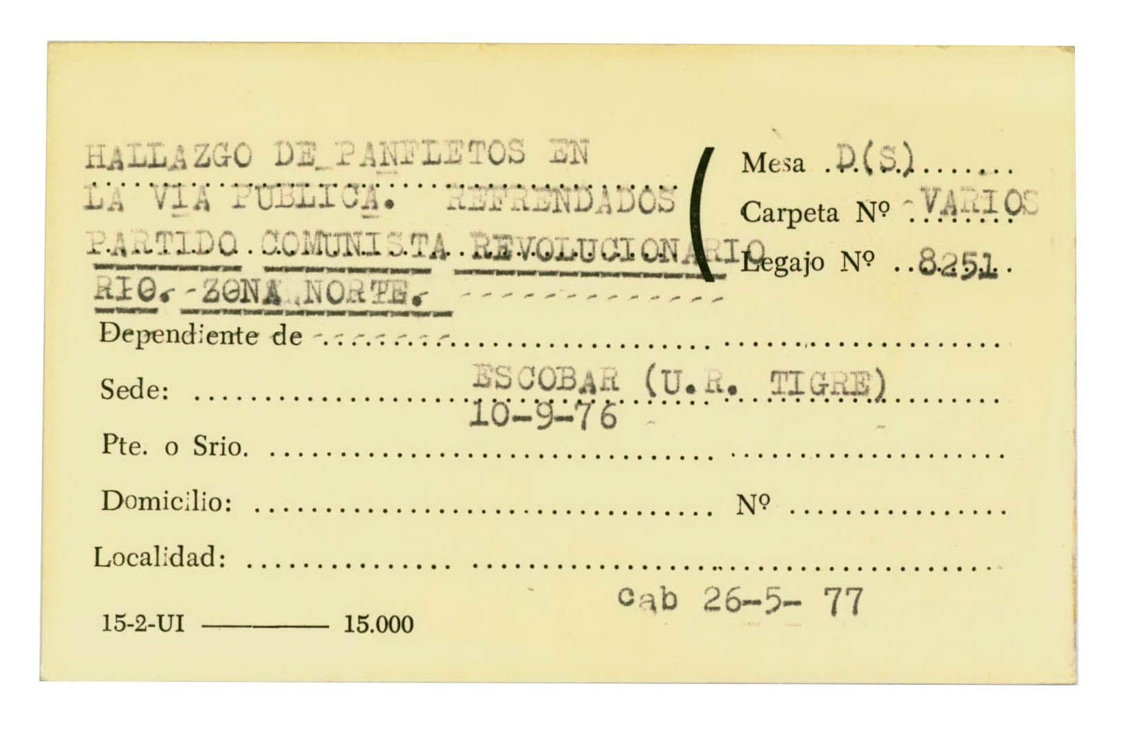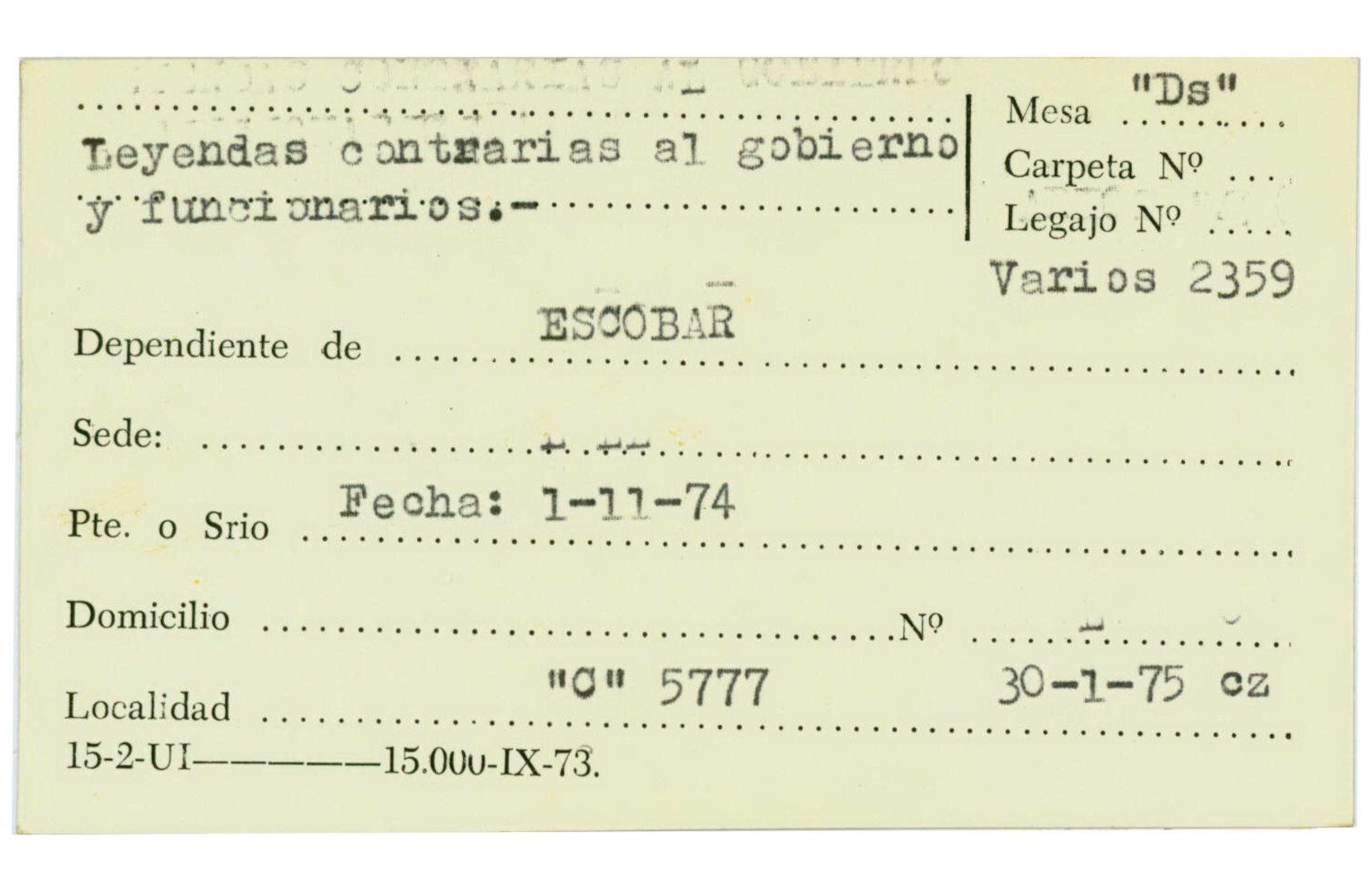 En algunos casos, los legajos a los que hacen referencia las fichas son Solicitudes de paradero, que dan cuenta de la búsqueda de los familiares que pedían a las autoridades judiciales y/o del ejecutivo saber si sus seres queridos estaban detenidos. En otros, se trata de información recogida previamente por la Dirección de inteligencia y son reveladoras de la persecución que ya se ejercía sobre las víctimas.