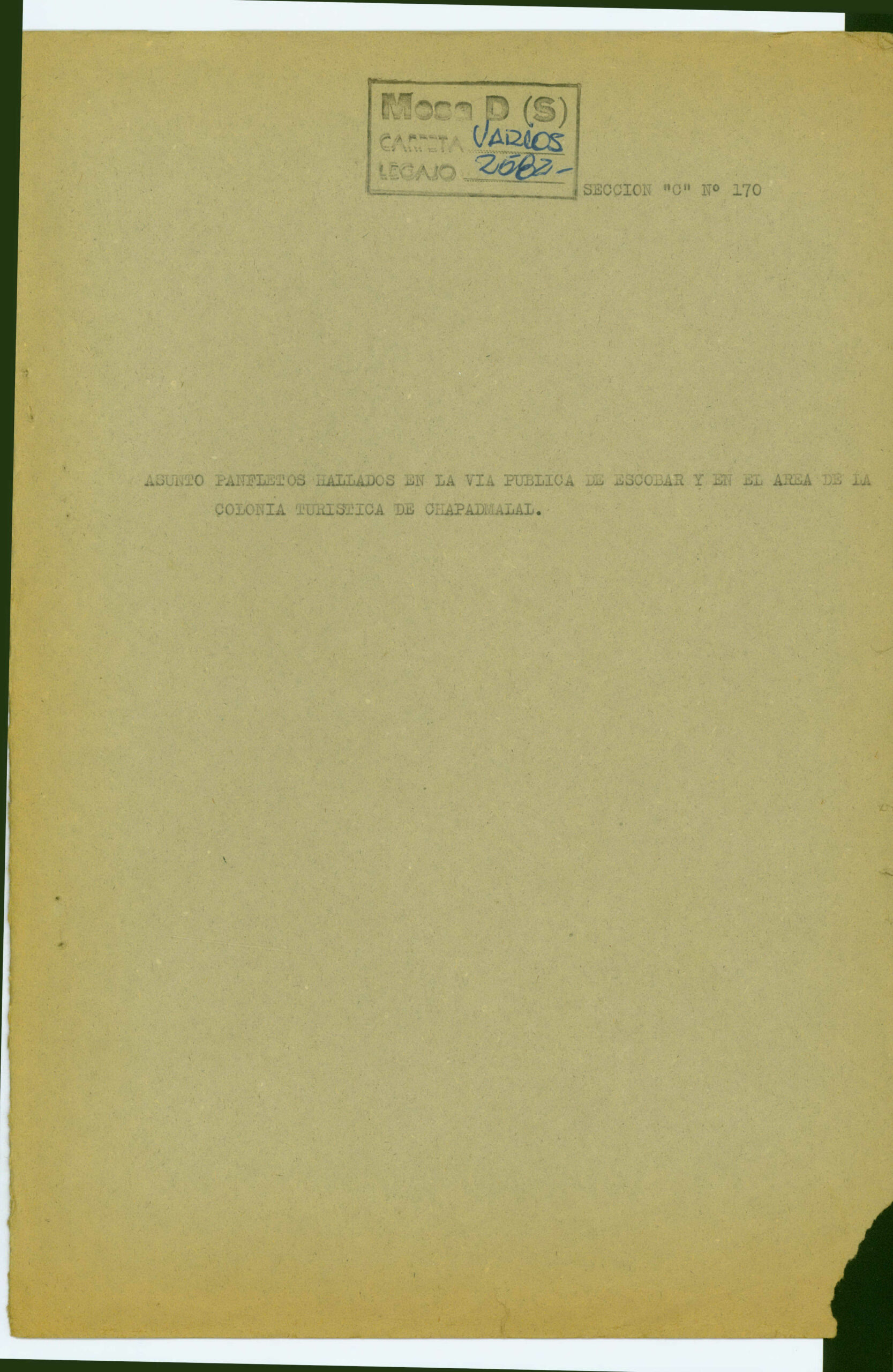 Carátula de legajo sobre hallazgo de panfletos en Escobar. CPM- Fondo DIPPBA- Div. Cen. AyF, Mesa DS, carpeta varios, legajo 2582. Año 1975.