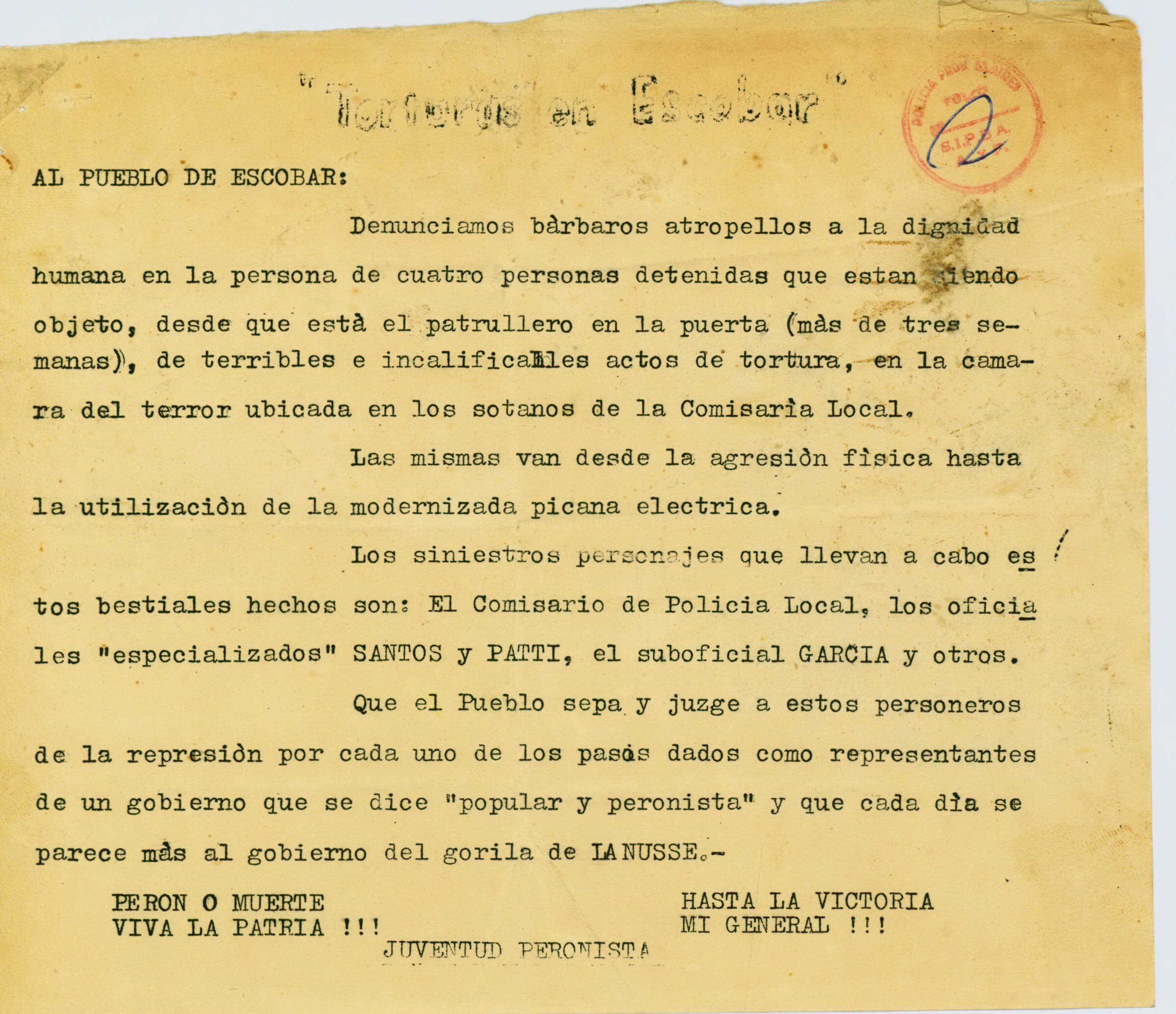 Volante firmado por la Juventud peronista de Escobar que denuncia la tortura a 4 personas detenidas en la comisaría local. Entre los agentes policiales denunciados, se encuentra Luis Abelardo Patti. CPM- Fondo DIPPBA- Div. Cen. AyF, Mesa DS, carpeta varios, legajo 2582. Año 1975.