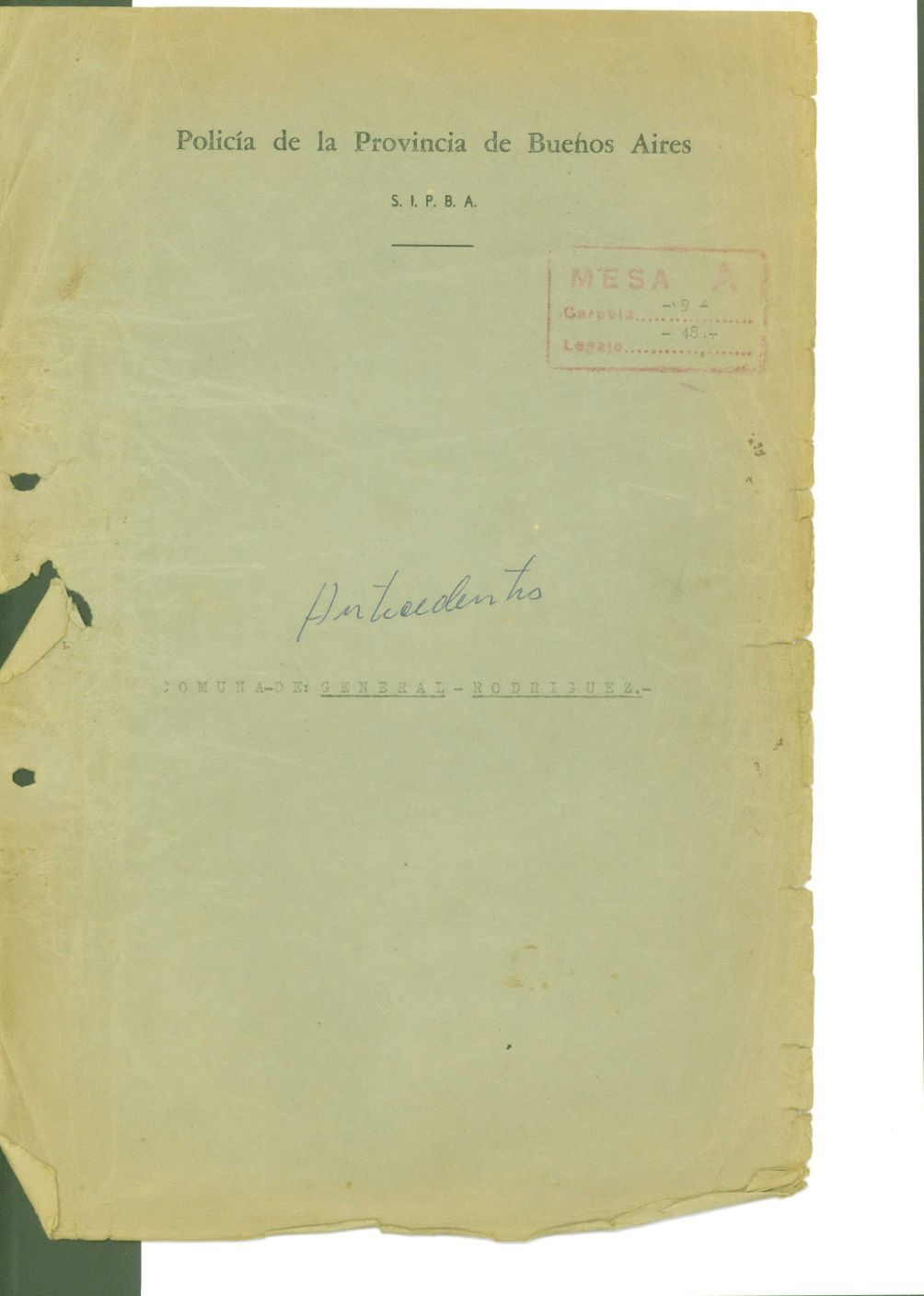Carátula de legajo de Antecedentes de comuna de General Rodríguez. CPM- Fondo DIPPBA- Div. Cen. AyF, Mesa A, Factor político, Carpeta 9, Legajo 48.