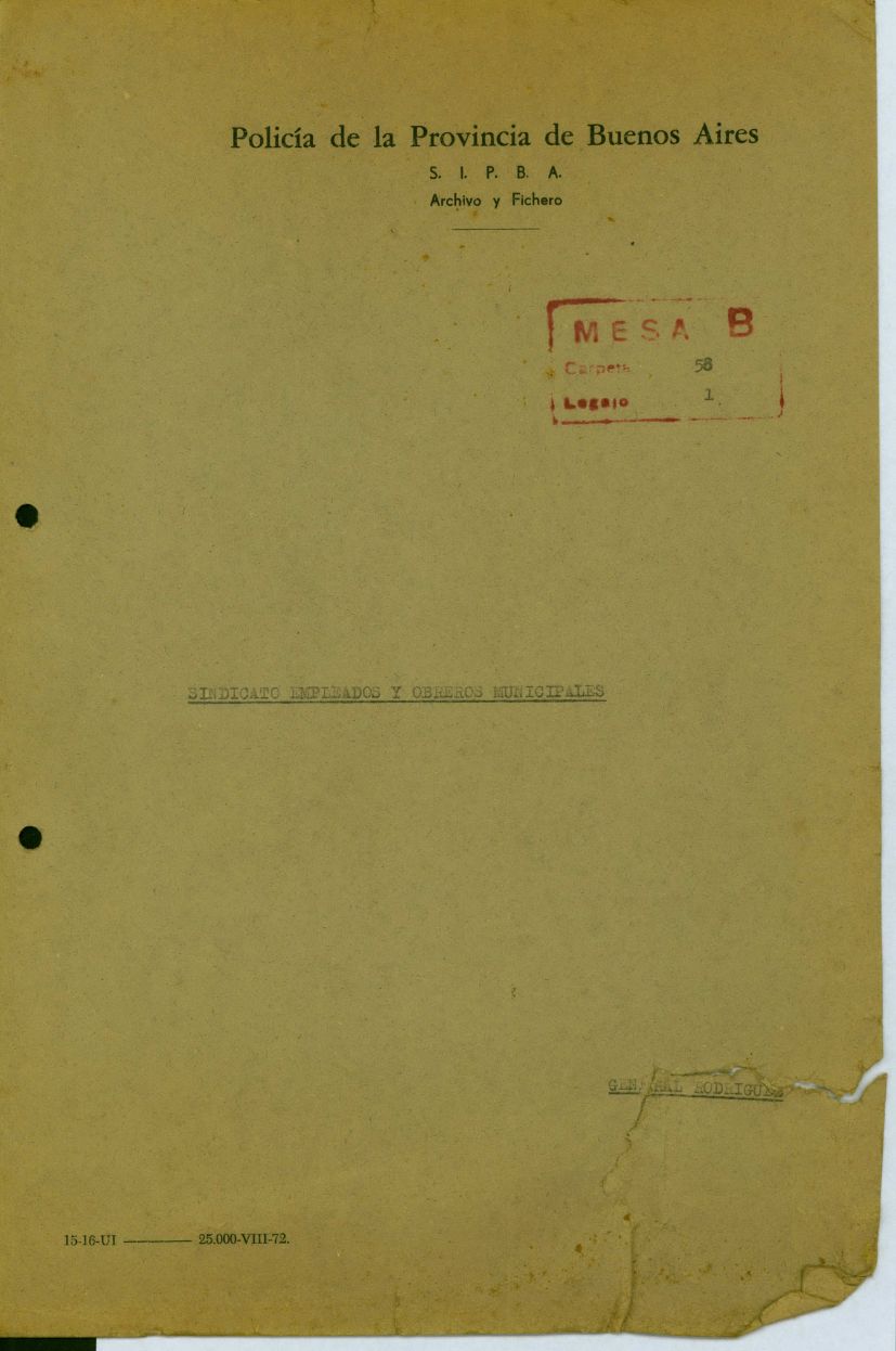 Carátula de legajo del Sindicato Empleados y Obreros Municipales. CPM – Fondo DIPPBA- Div. Cen. AyF, Mesa B, Factor Gremial, Carpeta 58, Legajo 1.