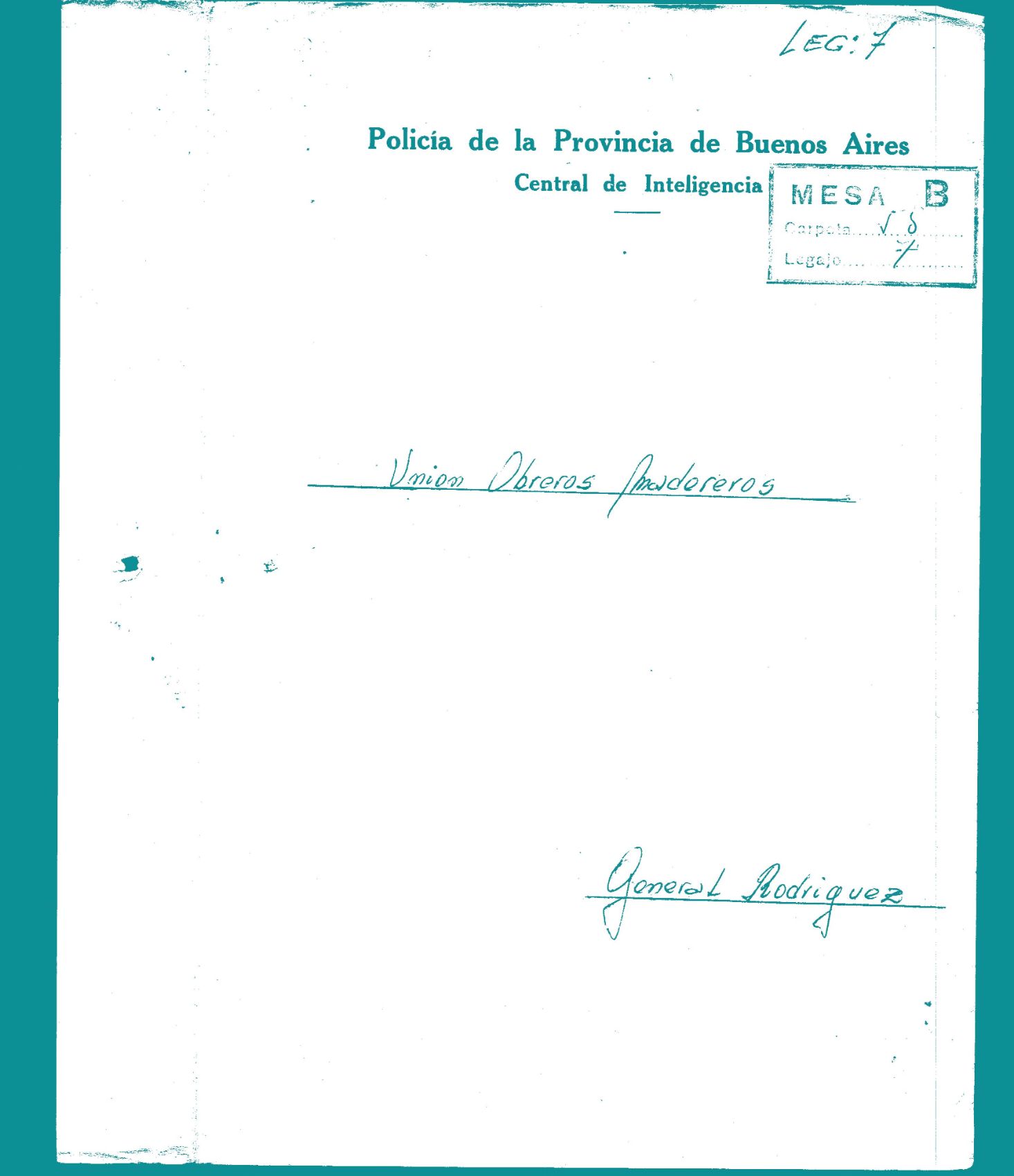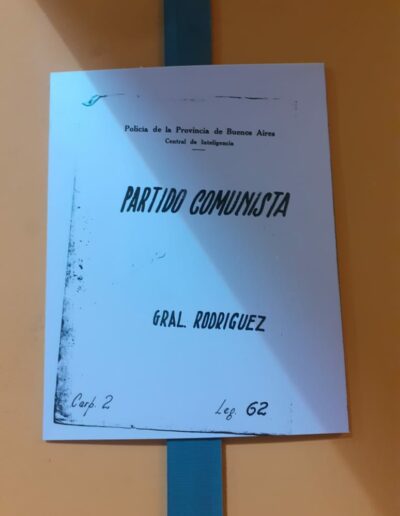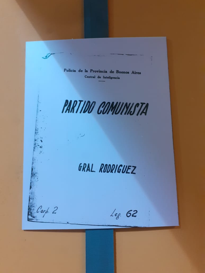 Carátula de legajo sobre el Partido Comunista en General Rodríguez”. CPM – Fondo DIPPBA- Div. Cen. AyF, Mesa C, Carpeta 2, Legajo 62.
