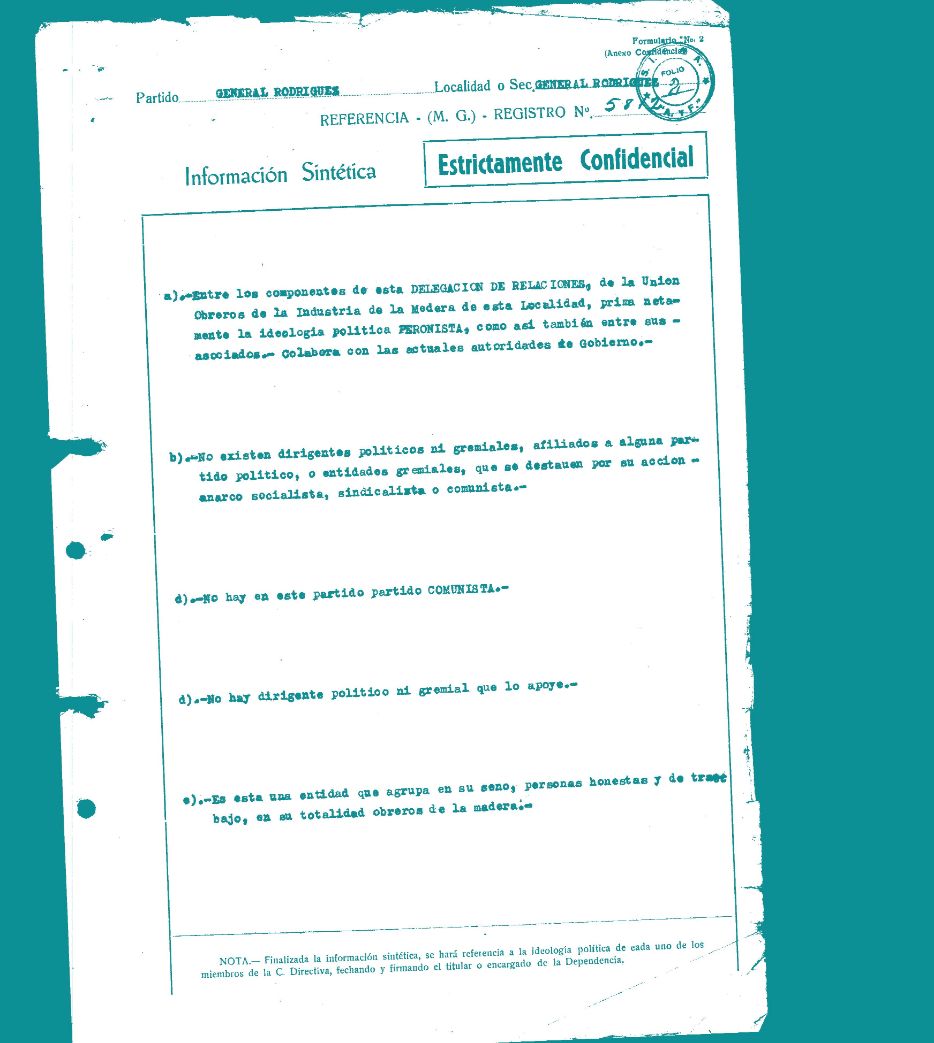 La mayor parte de la información que encontramos en el archivo era producida en las delegaciones. Éstas reunían la información a partir de “factores” (estudiantil, político, comunal, gremial, laboral, económico, religioso, social) y luego la remitían a la DIPPBA Central, que las clasificaba y archivaba en la División Central de Documentación Registro y Archivo.