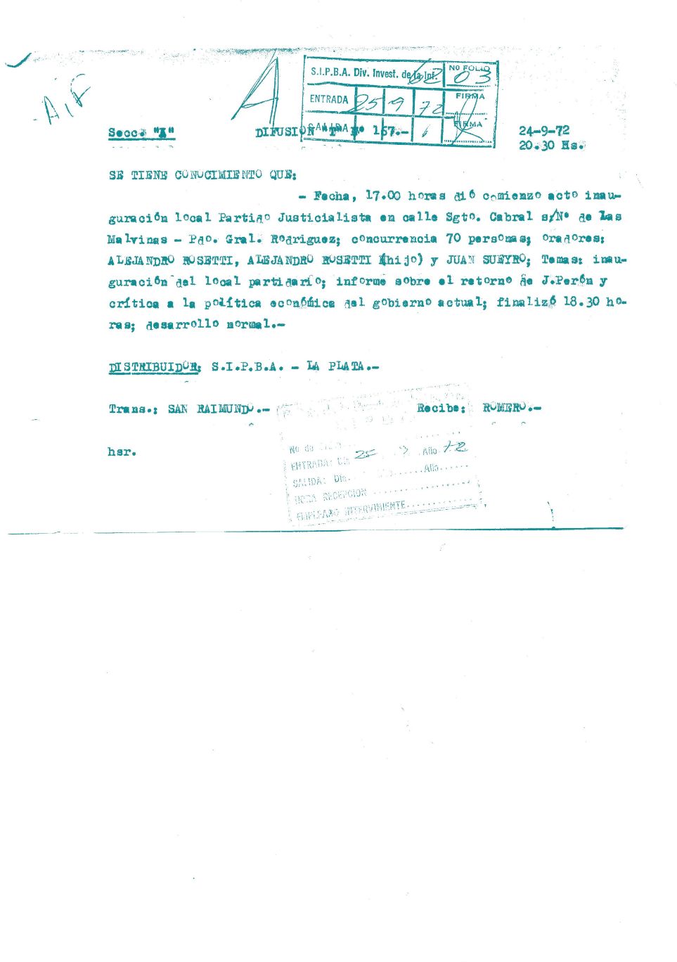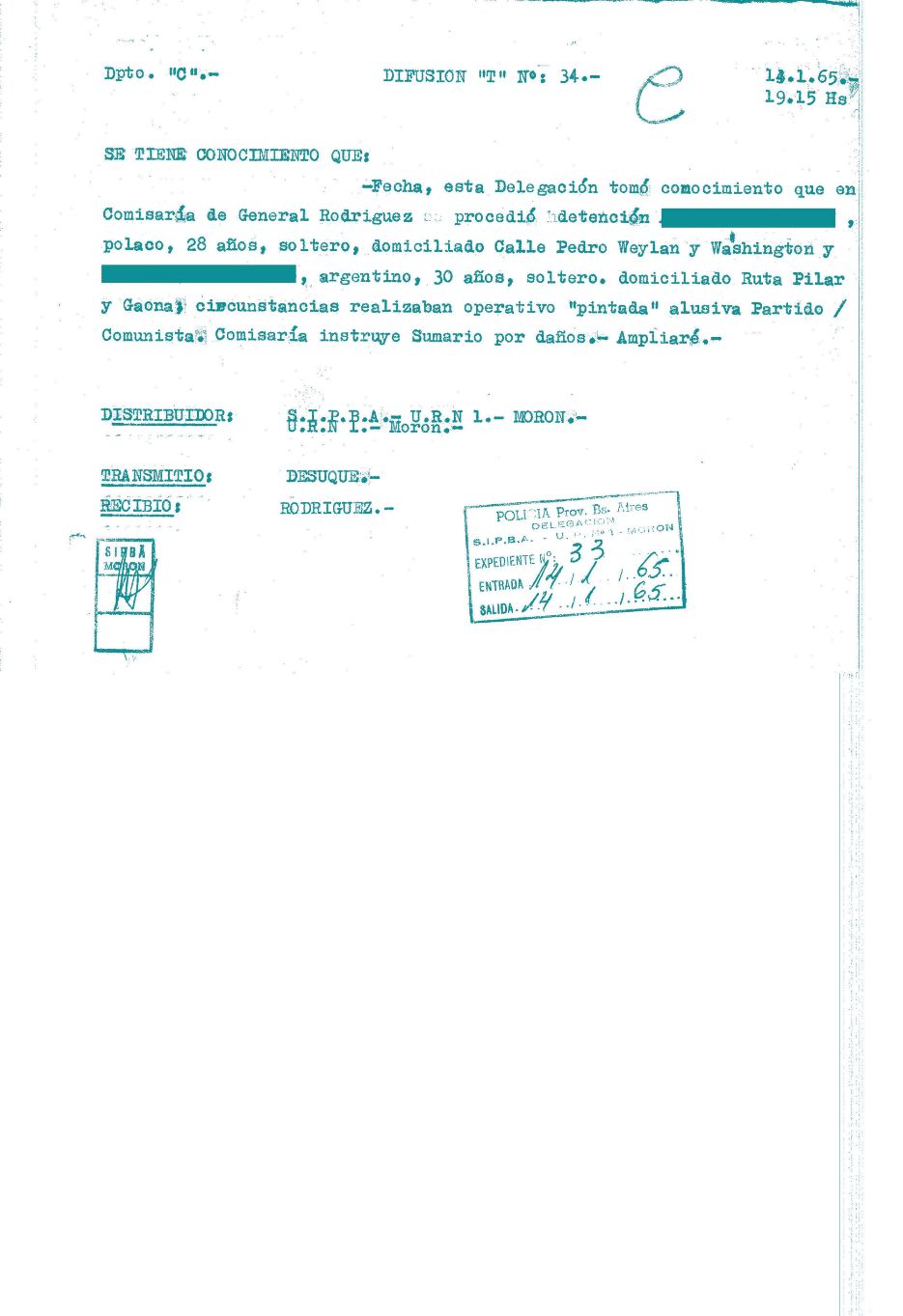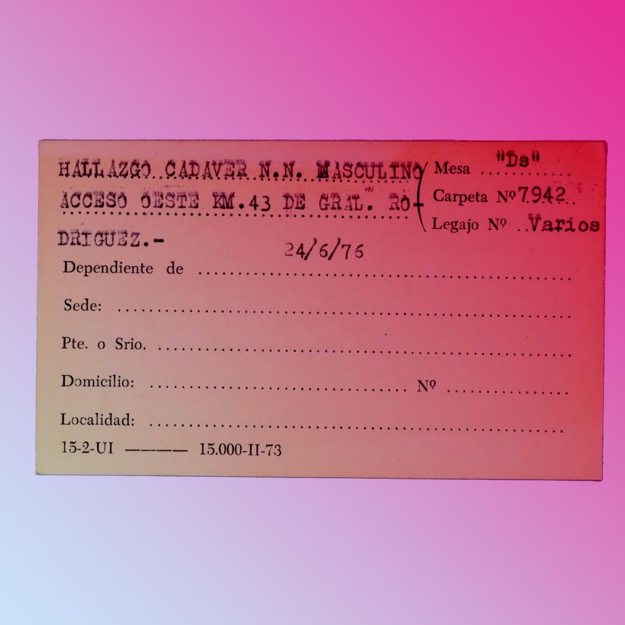 Dentro de los archivos que fueron preservados por la Comisión Provincial de la Memoria respecto de la Dirección de Inteligencia de la Provincia de Buenos Aires (DIPBA) puede observarse la ficha que da cuenta del hallazgo del cadáver referenciado.
