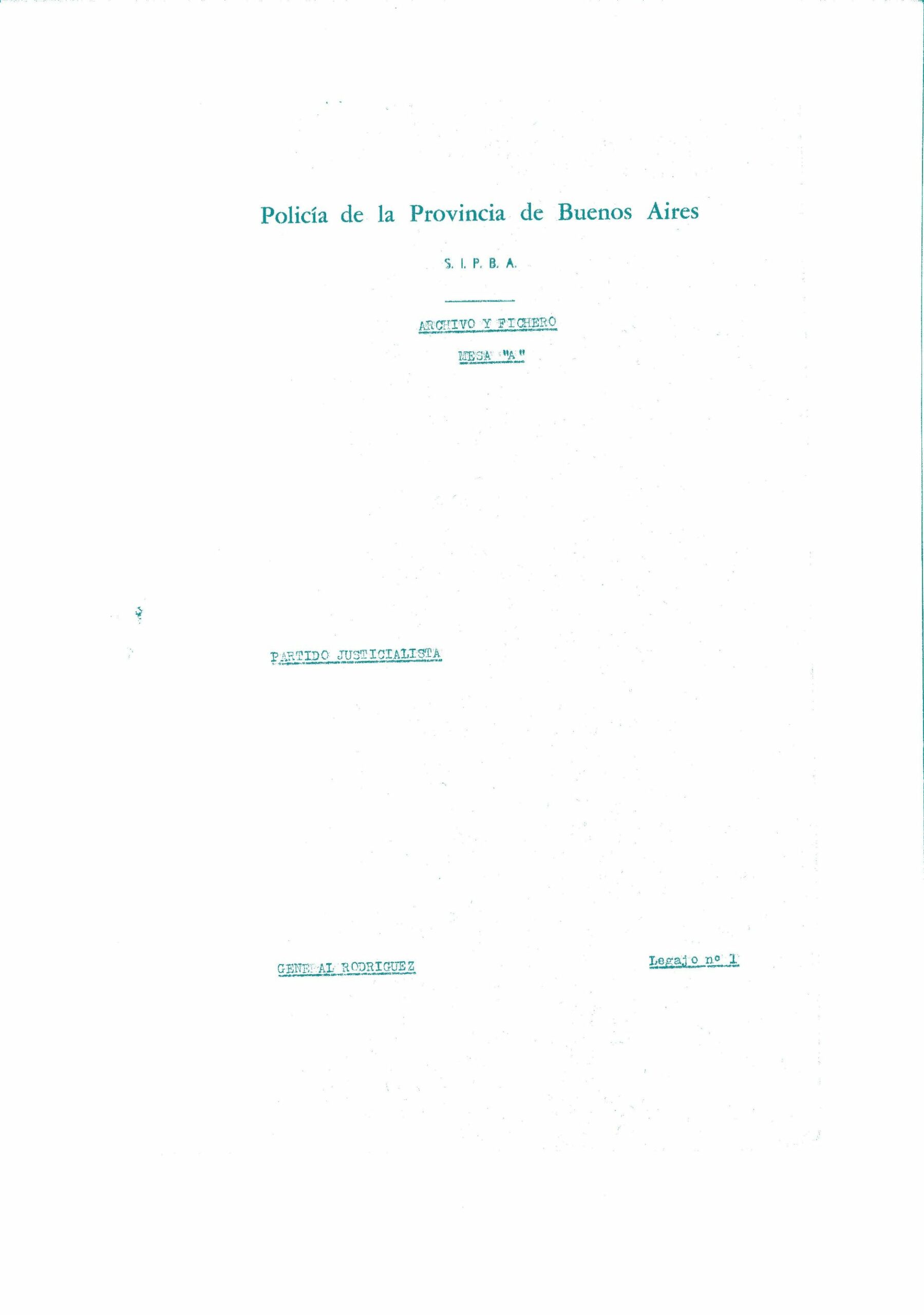 Carátula de legajo sobre el Partido Justicialista de General Rodríguez - CPM- Fondo DIPPBA- Div. Cen. AyF, Mesa A, Factor político, Carpeta por Localidad, Legajo 1.