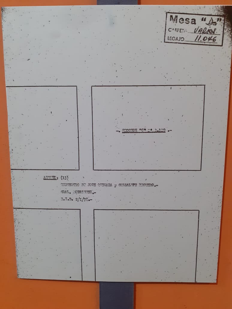 Carátula de legajo sobre la denuncia de secuestro de José Quesada y Guadalupe Del Reguero. CPM- Fondo DIPPBA- Div. Cen. AyF, Mesa Ds, Carpeta Varios, Legajo 11046. Año 1978