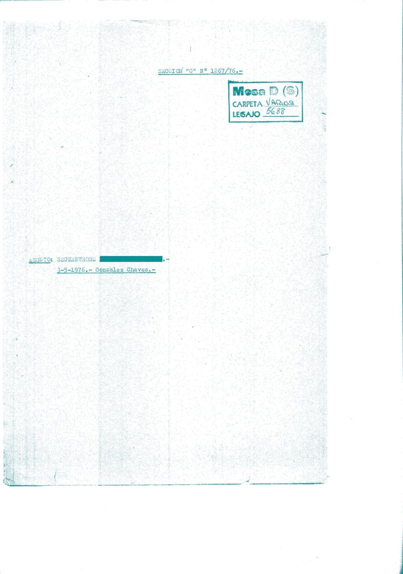 Carátula de legajo de la Mesa Ds sobre el Secuestro de “Secuestro de XXX XXX XXX”. CPM- Fondo DIPPBA- Div. Cen. AyF, Mesa DS, Carpeta Varios, legajo 5688. Año 1976.