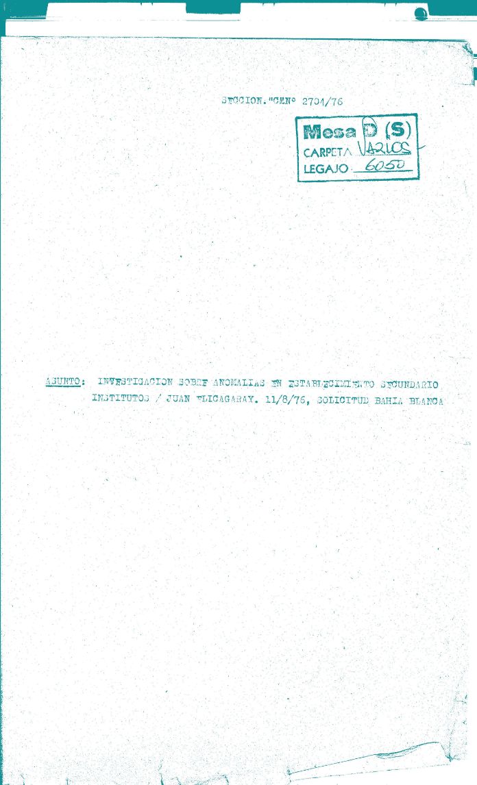 Carátula del legajo sobre “Investigación sobre anomalías en establecimiento secundario. Instituto Juan Elicagaray”. CPM- Fondo DIPPBA- Div. Cen. AyF, Mesa DS, Carpeta Varios, legajo 6050. Año 1976.