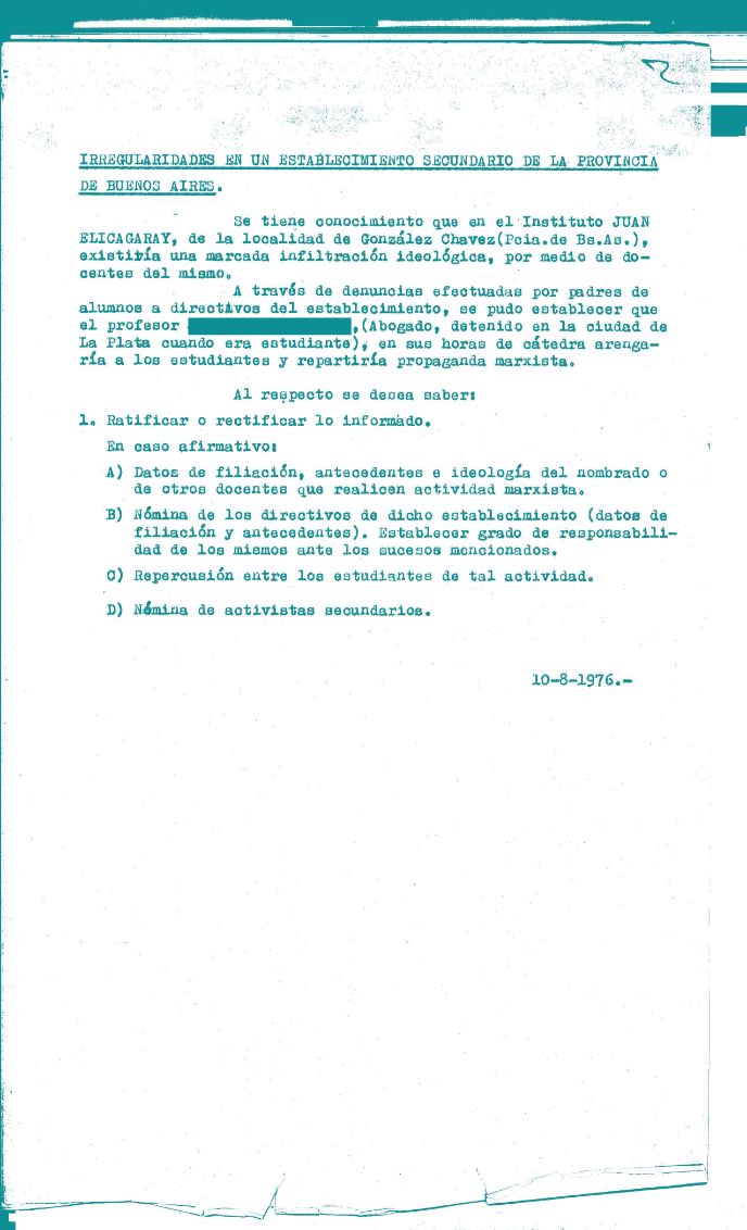 La escuela no escapó a la dinámica represiva que las Fuerzas Armadas instalaron en nuestro país entre 1976 y 1983. Por ser un espacio de producción de conocimientos y circulación de saberes, era considerada un ámbito de potencial amenaza y, al mismo tiempo, un dispositivo de disciplinamiento social que debía ser observado y vigilado.