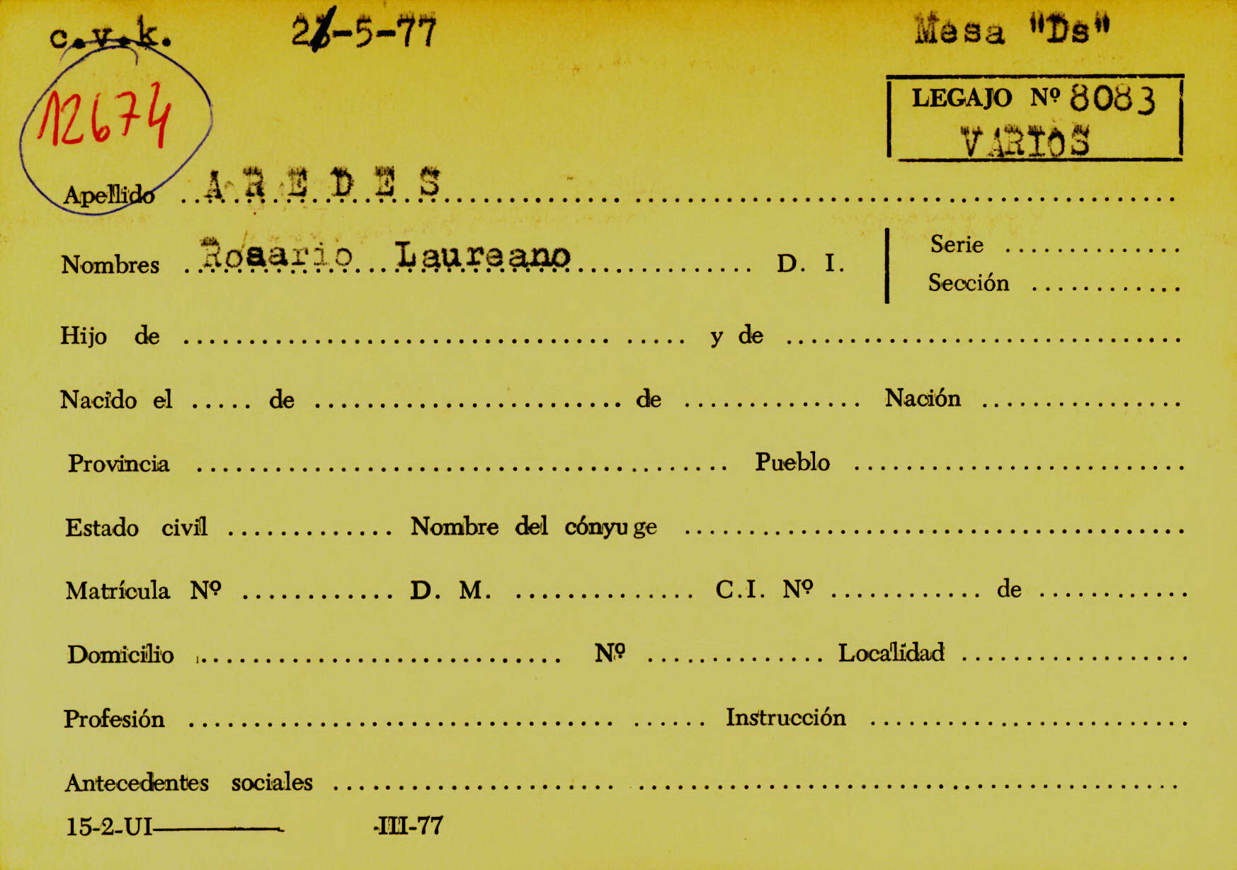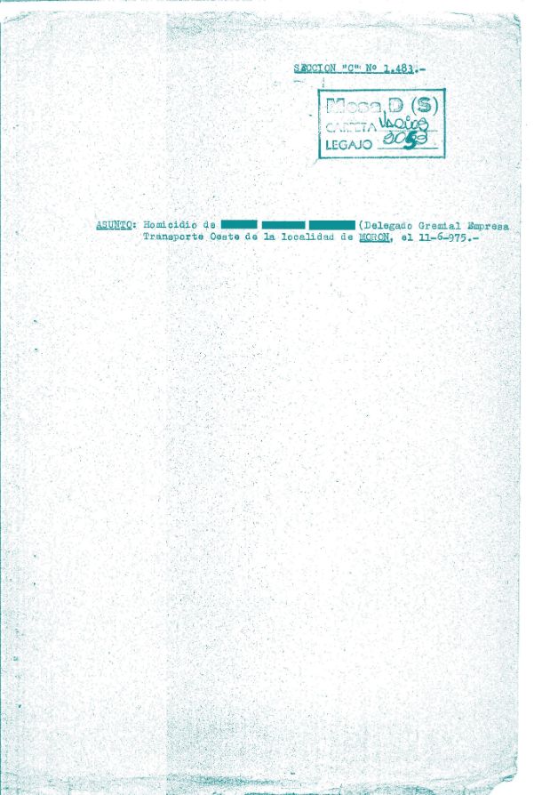 Carátula del legajo sobre el Homicidio del Delegado Gremial Empresa Transporte Oeste. CPM- Fondo DIPPBA- Div. Cen. AyF, Mesa DS, carpeta varios, legajo 3053. Año 1975.
