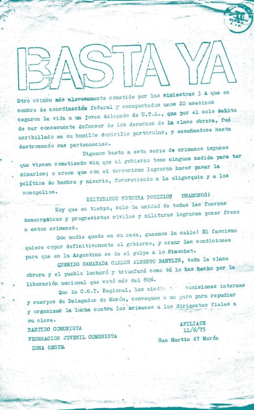 Volante firmado por el Partido Comunista Zona Oeste y la Federación Juvenil Comunista titulado “Basta Ya”, en el que hacen un llamamiento a la C.G. T Regional para que convoque a paro en repudio del asesinato. CPM- Fondo DIPPBA- Div. Cen. AyF, Mesa DS, carpeta varios, legajo 3053. Año 1975.
