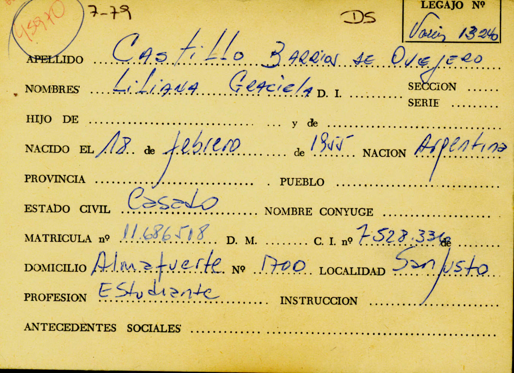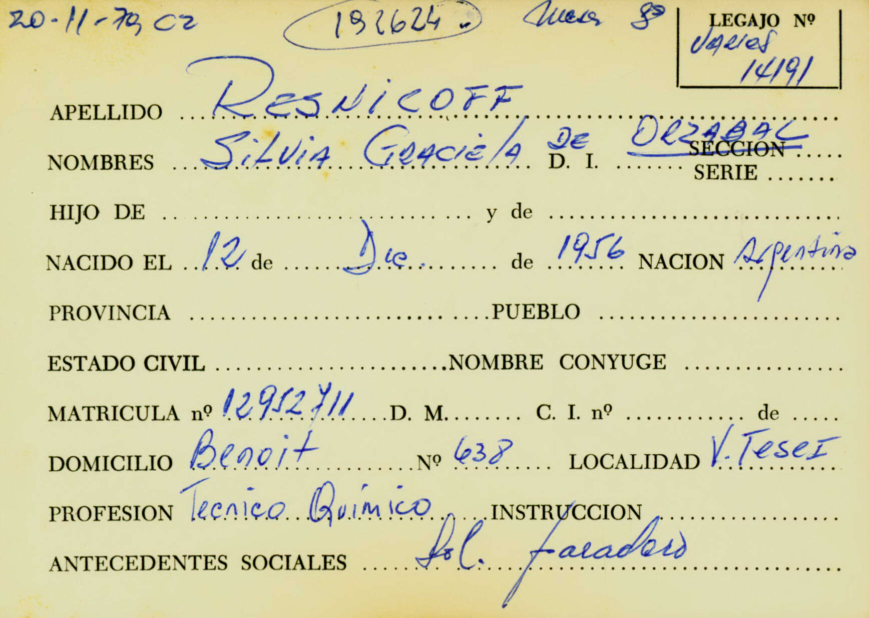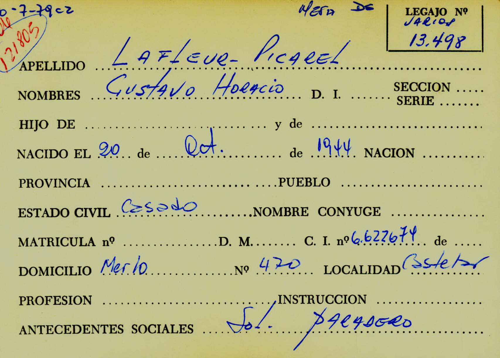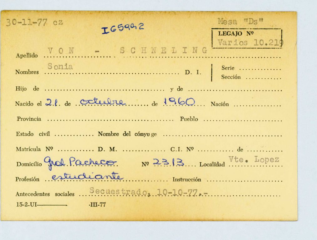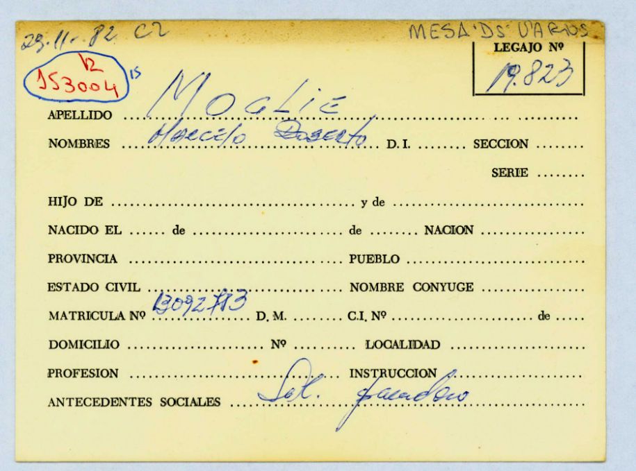 Ficha personal de Marcelo Roberto Moglie (desaparecido el 5 de enero de 1977 a los 18 años), que remite al Legajo de Mesa DS 19.823 por solicitud de paradero. CPM- Fondo DIPPBA- Div. Cen. AyF, fichero onomástico.