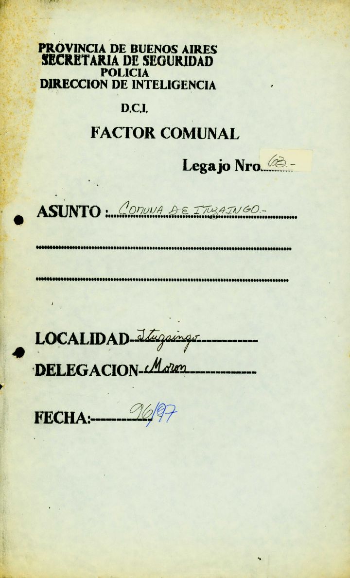 Carátula del legajo sobre la “Situación político-comunal de Ituzaingó". CPM- Fondo DIPPBA – Div. Cen. AyF, Material sin Mesa, Factor Comunal, Legajo 134. Año 1995.