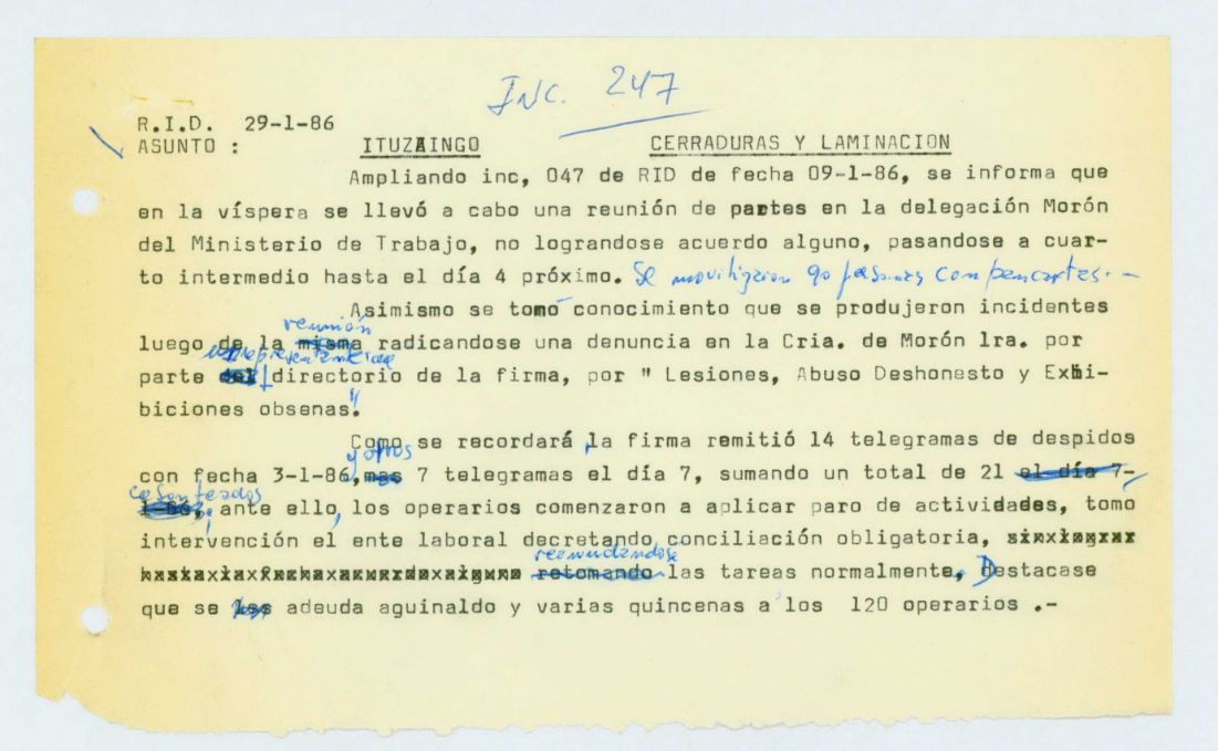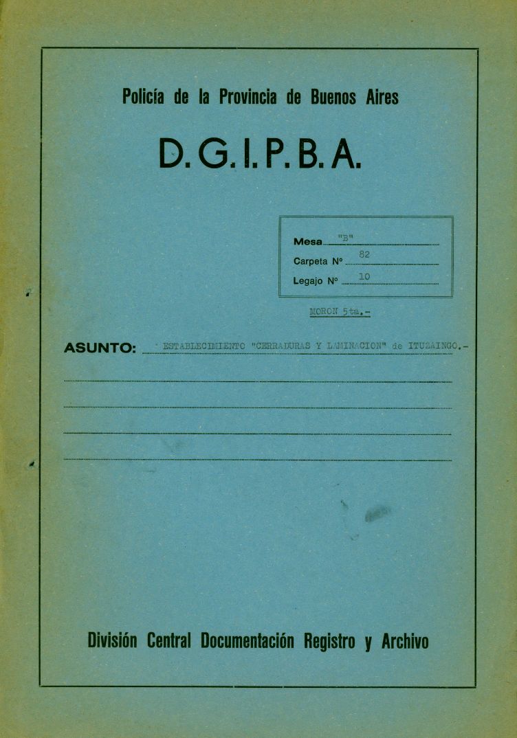 Carátula del legajo del Establecimiento Cerraduras y Laminación de Ituzaingó. CPM- Fondo DIPPBA – Div. Cen. AyF, Mesa B, Carpeta 82, Legajo 10. Fechas extremas del legajo: 1985 – 1990.