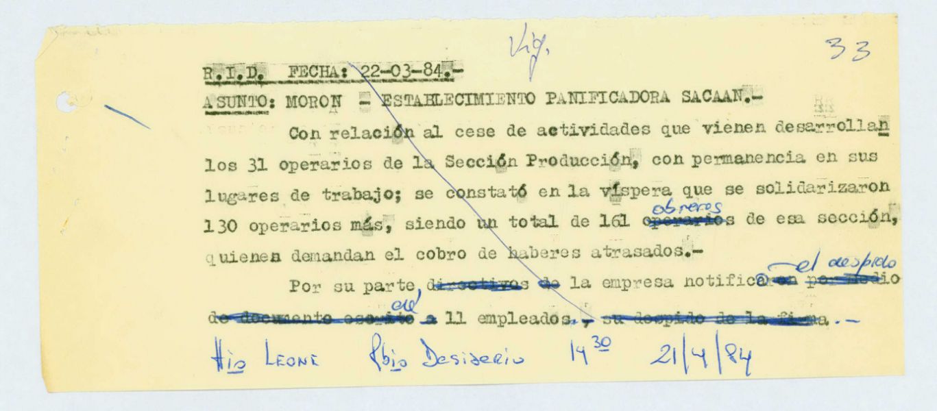 Carátula del legajo de la Empresa Panificadora Sacaan. CPM- Fondo DIPPBA – Div. Cen. AyF, Mesa B, Carpeta 82, Legajo 12. Fecha 1984.