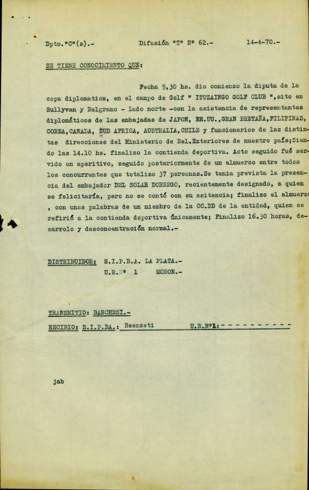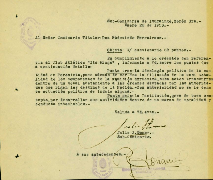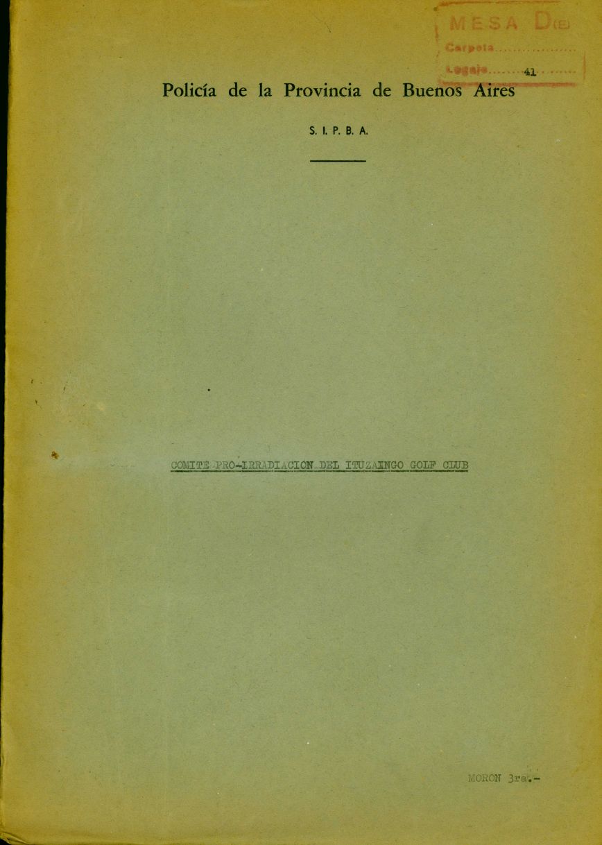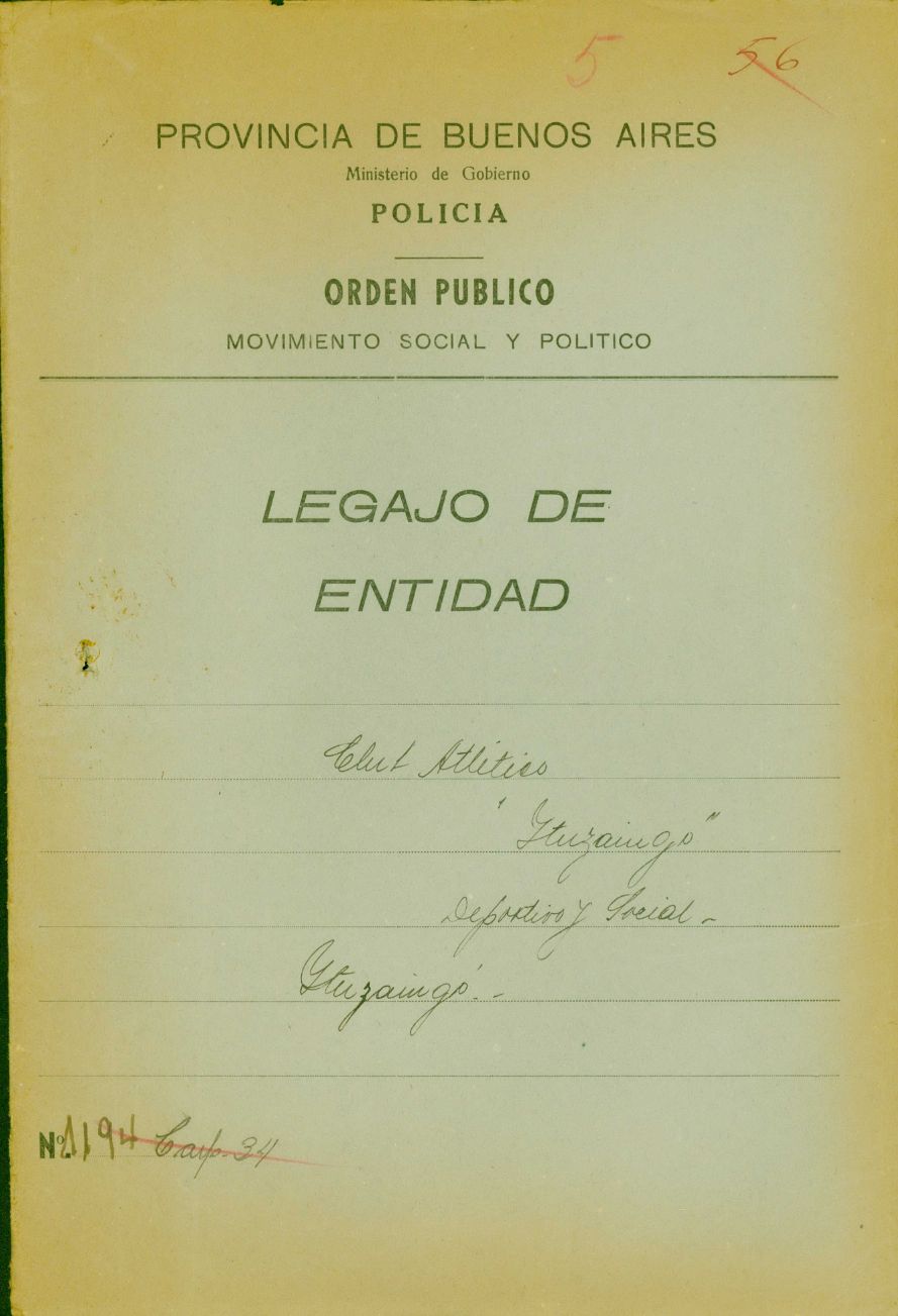 Carátula de legajo de la División de Orden público sobre entidades sociales. La División de Orden público antecede a la DIPPBA, pero algunos de sus documentos integran el fondo documental. CPM- Fondo DIPPBA- Div. Cen. AyF. Mesa De, por localidad, legajo 5. Asunto: Club Atlético "Ituzaingó".