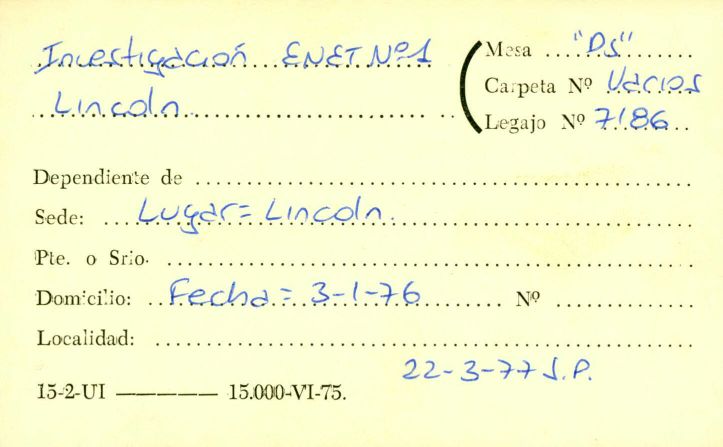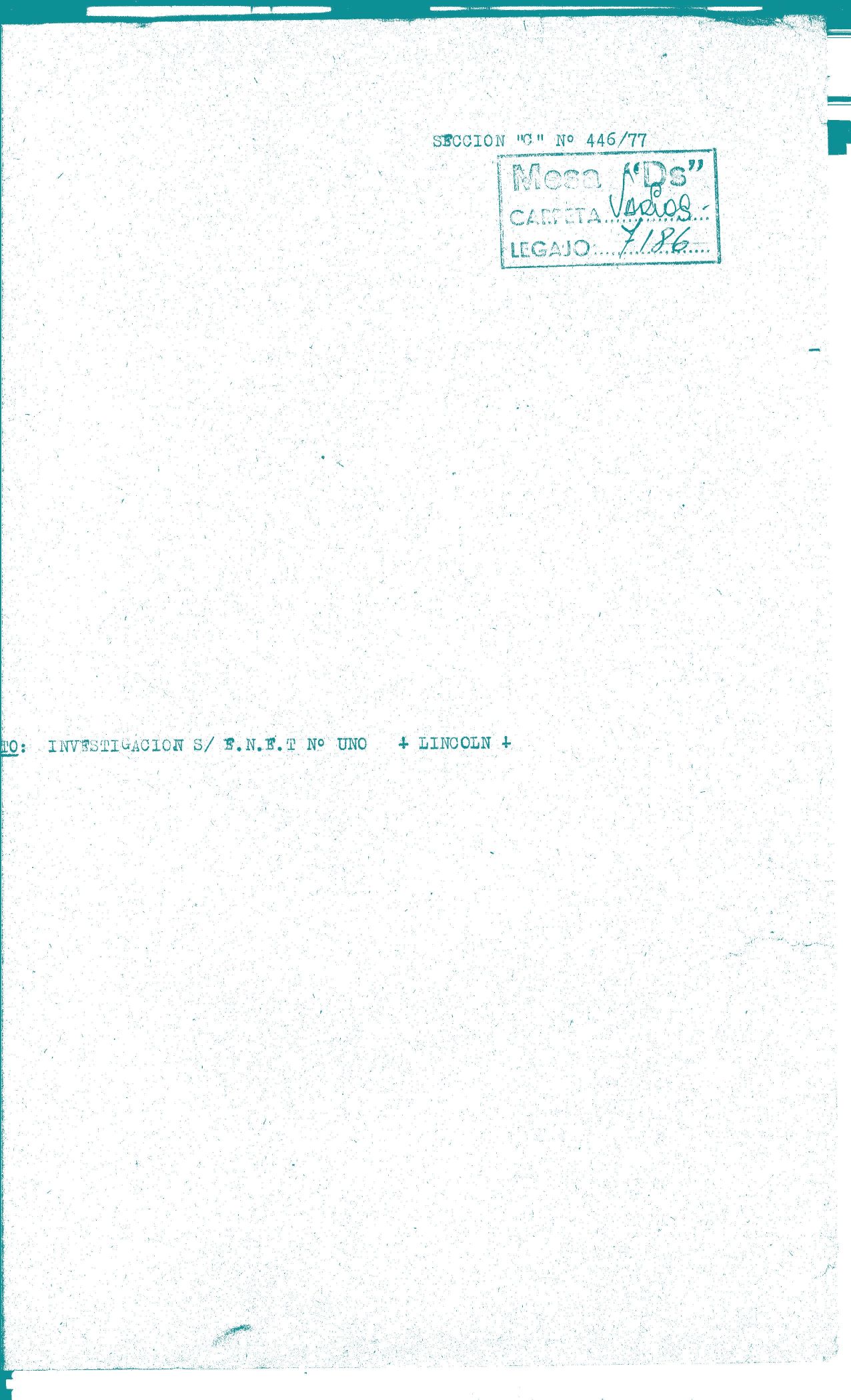 Carátula del Legajo de Mesa DS sobre investigación E.n.e.t. Nº 1 de Lincoln. CPM- Fondo DIPPBA- Div. Cen. AyF, Mesa DS, Factor Varios, Legajo 7186. Año 1976.
