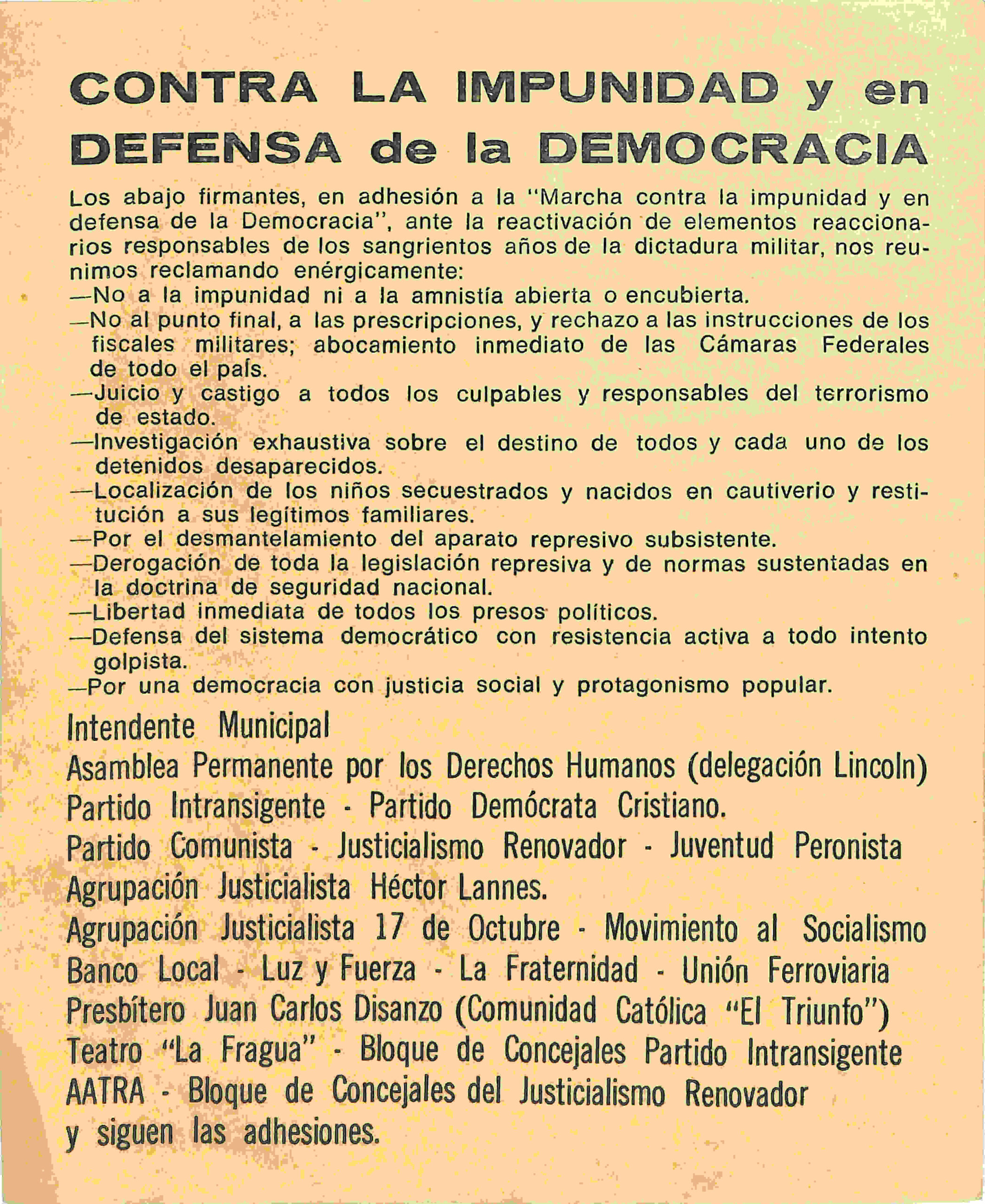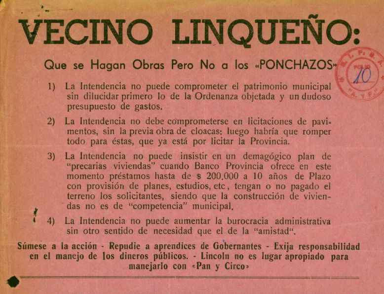 Panfleto del legajo de Antecedentes comunales de Lincoln. De acuerdo al informe de inteligencia de la DIPPBA, el panfleto había sido elaborado por la Cámara de Comercio e Industria y la Sociedad Rural, que se oponían a la reforma tributaria realizada por el intendente Marcelo Arabolaza (UCRI). CPM- Fondo DIPPBA- Div. Cen. AyF, Mesa A, Factor Político, Carpeta 10, Legajo 62. Año 1964.