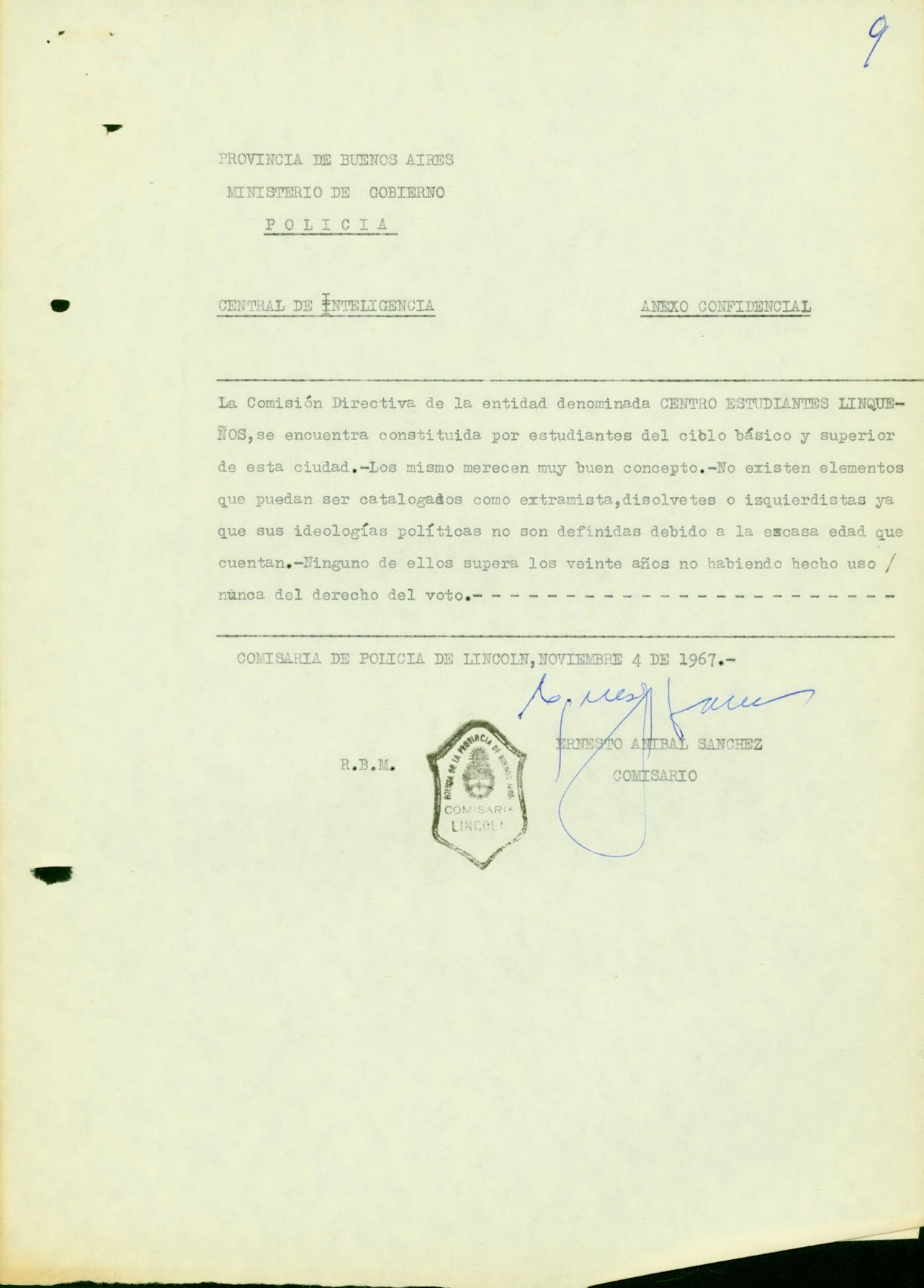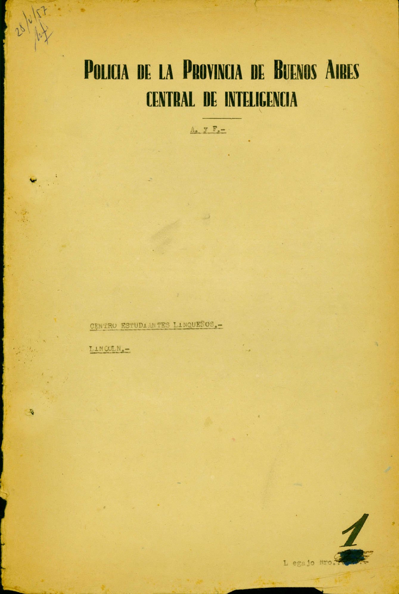 Carátula del legajo del Centro de Estudiantes de Lincoln. CPM- Fondo DIPPBA- Div. Cen. AyF, Mesa A, factor estudiantil, Legajo 1.