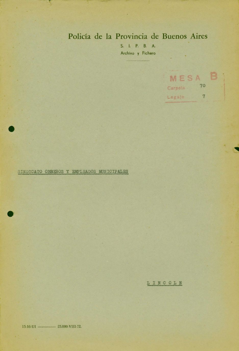 Carátula del legajo del Sindicato Obreros y Empleados municipales de Lincoln. CPM- Fondo DIPPBA- Div. Cen. AyF, Mesa B, carpeta 70, legajo 7. Año 1957.
