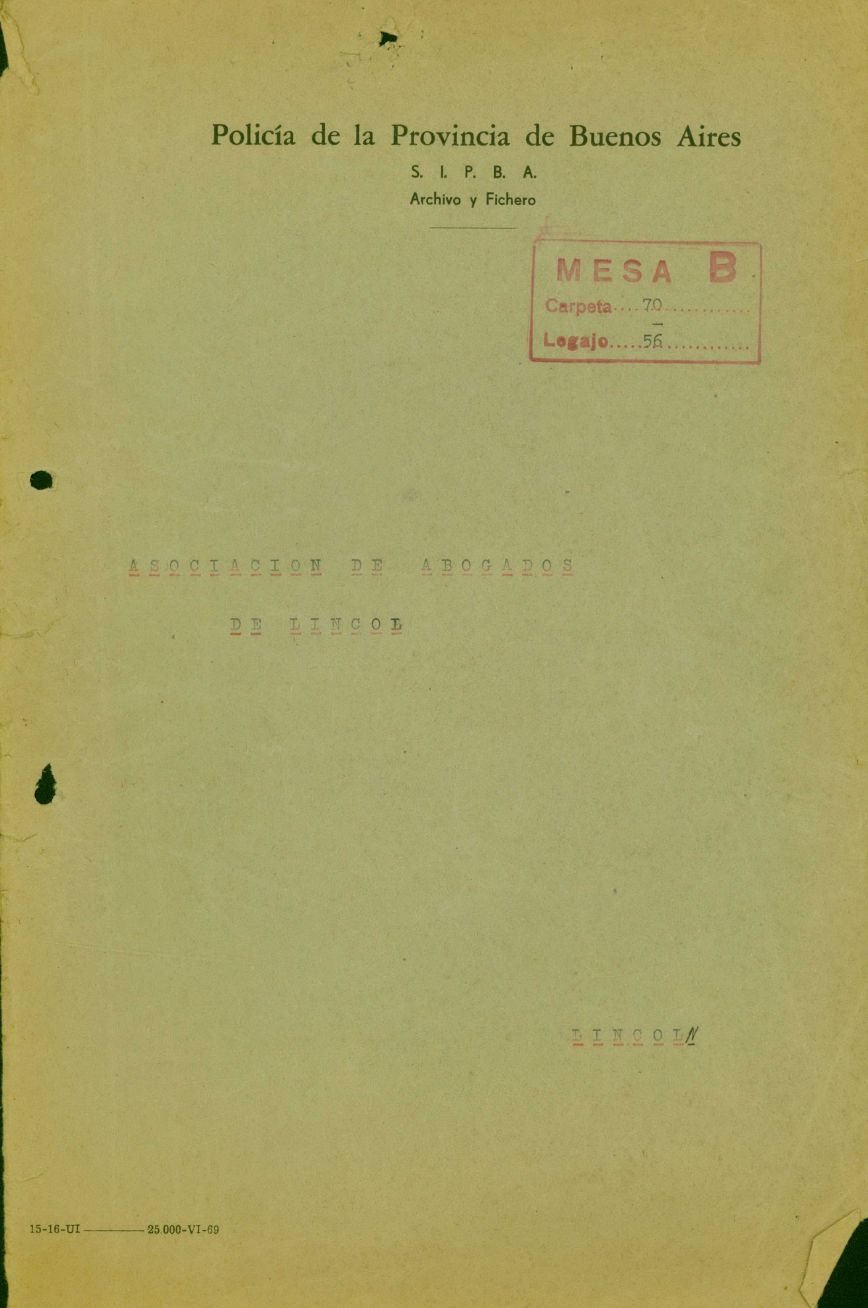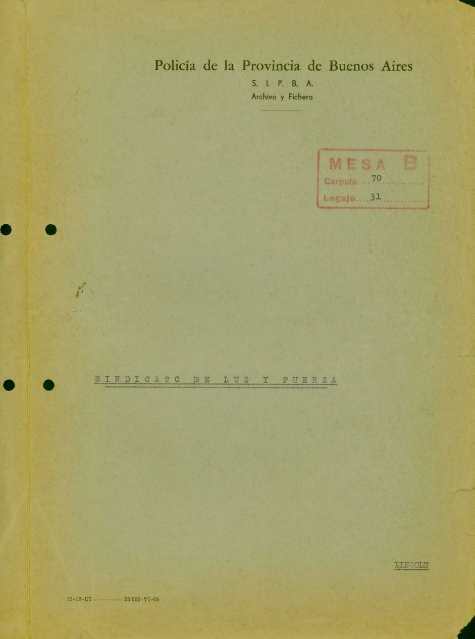 Carátula del legajo de la Unión Ferroviaria de Lincoln. CPM- Fondo DIPPBA- Div. Cen. AyF, Mesa B, carpeta 70, legajo 46.