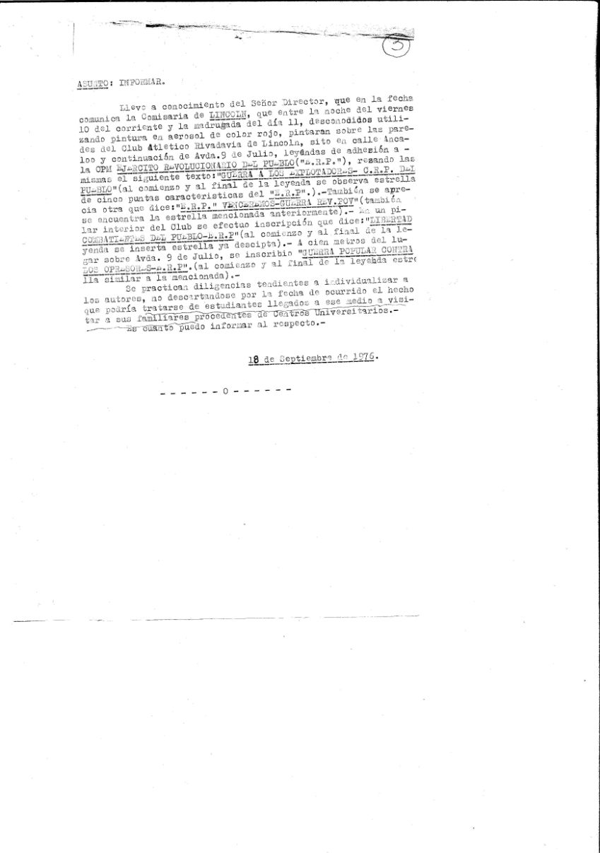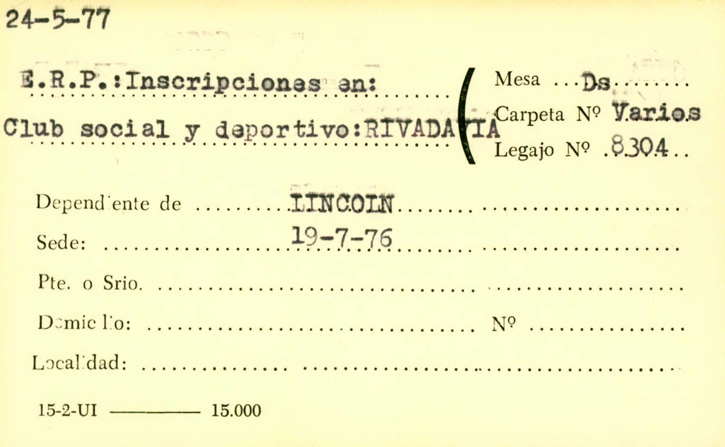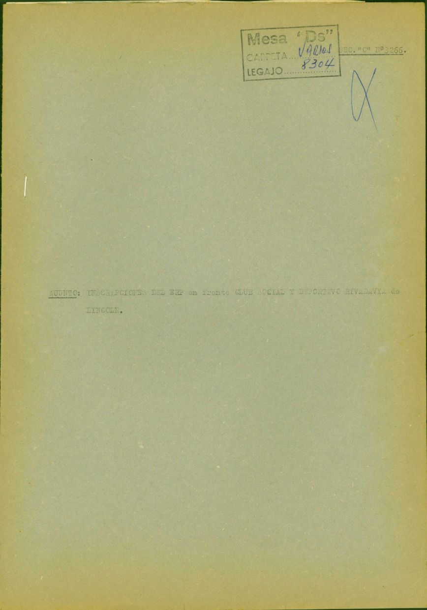 Carátula del legajo “Inscripción del E.R.P. en club social y deportivo Rivadavia de Lincoln". Año 1977. CPM- Fondo DIPPBA- Div. Cen. AyF, Mesa DS, Factor Varios, Legajo 8304. Año 1976.