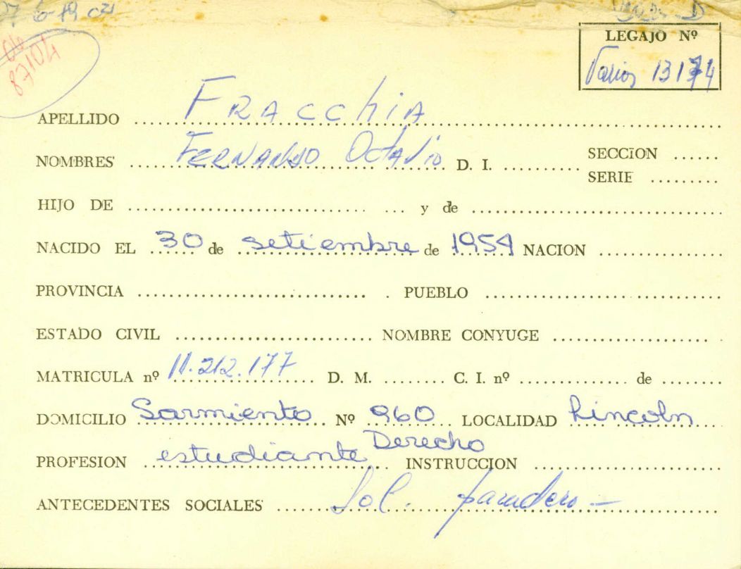 Ficha personal de Fracchia Fernando Octavio, que remite al legajo mesa Ds Varios, 13174. CPM- Fondo DIPPBA- Div. Cen. AyF. Fichero onomástico. Año 1979.