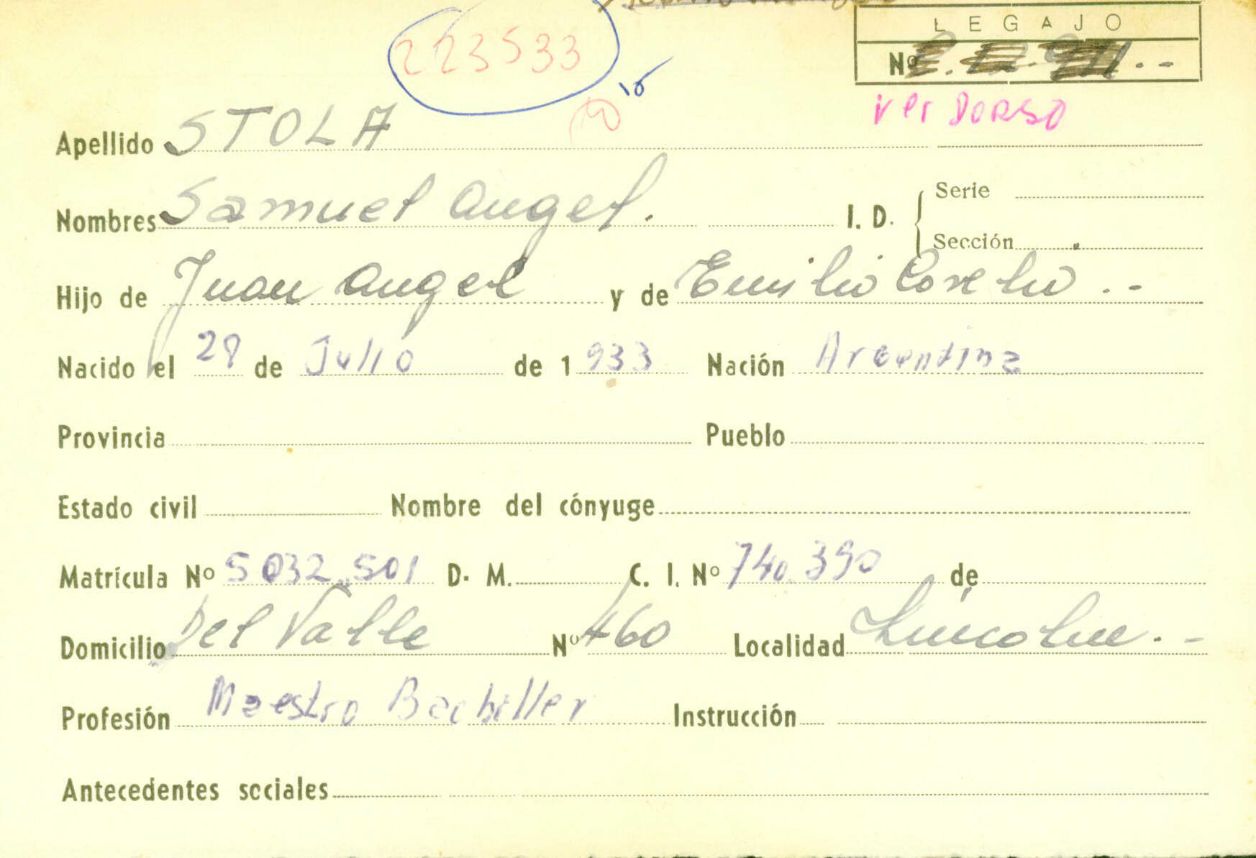 Ficha personal de Stola Samuel Angel. CPM- Fondo DIPPBA- Div. Cen. AyF. Fichero onomástico. Año 1979.