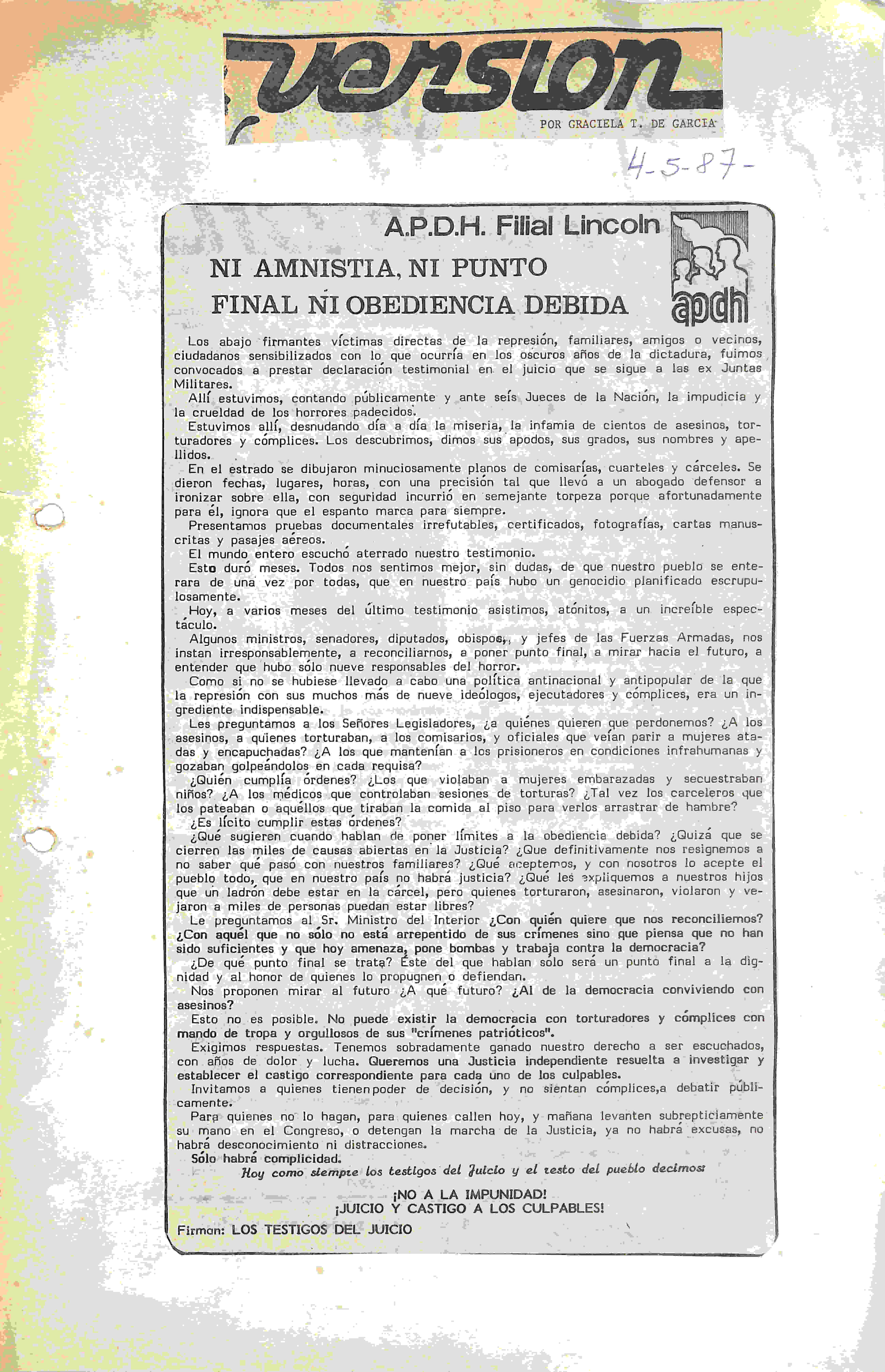 Sinopsis: Los chicos de la EEST N°1 recuerdan a José María Cane, Roberto Stefano, Fernando Fracchia, Daniel Di Nella, Elvio Franzosi, Samuel Stola, Dora Frazosi y Osvaldo Departi, vecinos de Lincoln desaparecidos durante la ultima dictadura militar. El dialogo con Débora Stola sirve para pensar aquellos días, la participación de su padre y los posibles motivos de su desaparición.