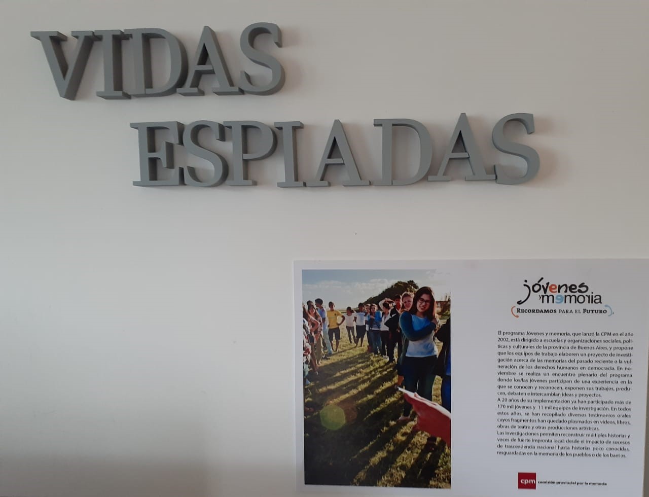 Como parte del trabajo conjunto entre la CPM y los municipios que participan del Programa, se inauguró en marzo de 2021, la muestra documental “Vidas espiadas, 50 años de inteligencia ilegal”, con documentos del archivo de la Dirección de Inteligencia de la Policía de la Provincia de Buenos Aires (DIPPBA).