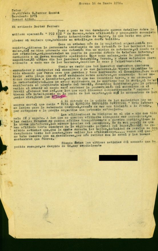 El Legajo 96 de la Mesa C que se inicia en enero del año 1956 con la carta de un ciudadano que denuncia un acto/picnic del Partido Comunista en Moreno -acompañado por 11 fotos de los concurrentes- son un registro acabado del clima de época en el que nace la DIPPBA.