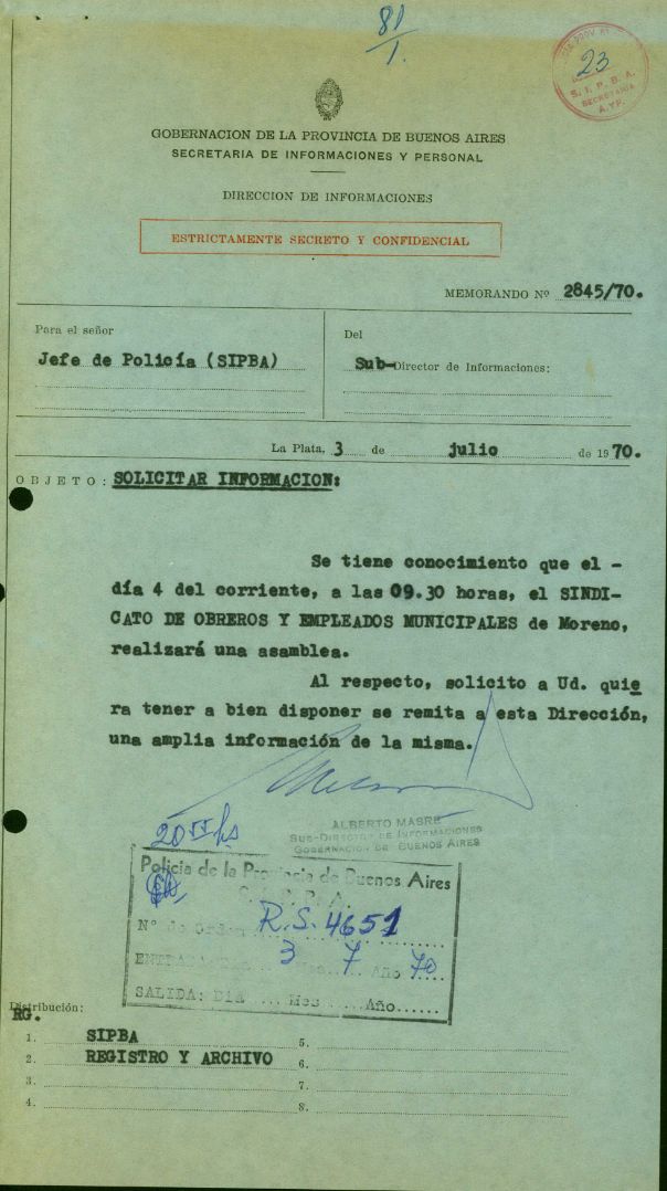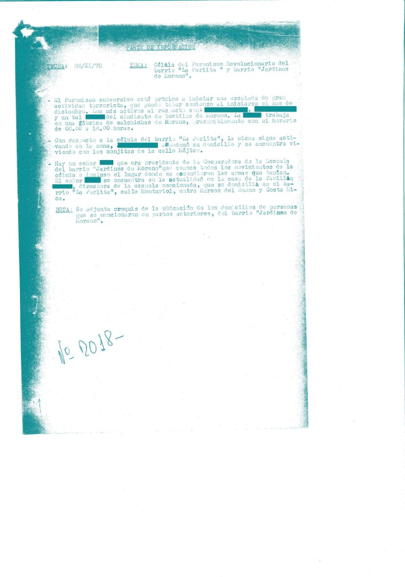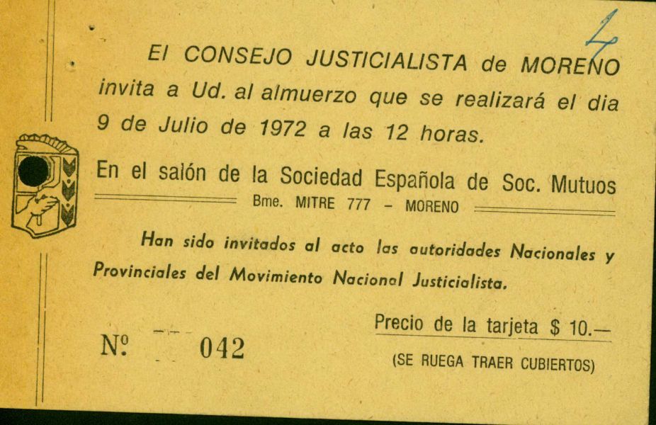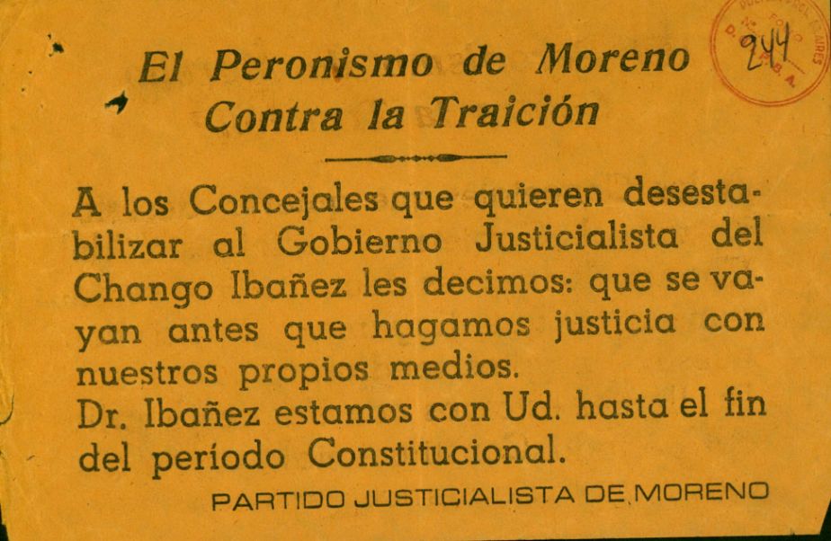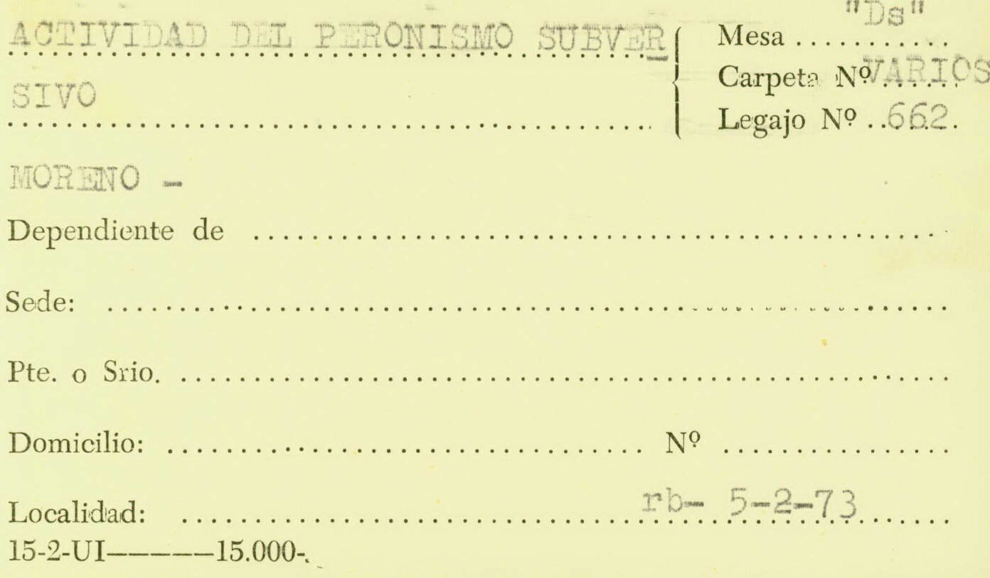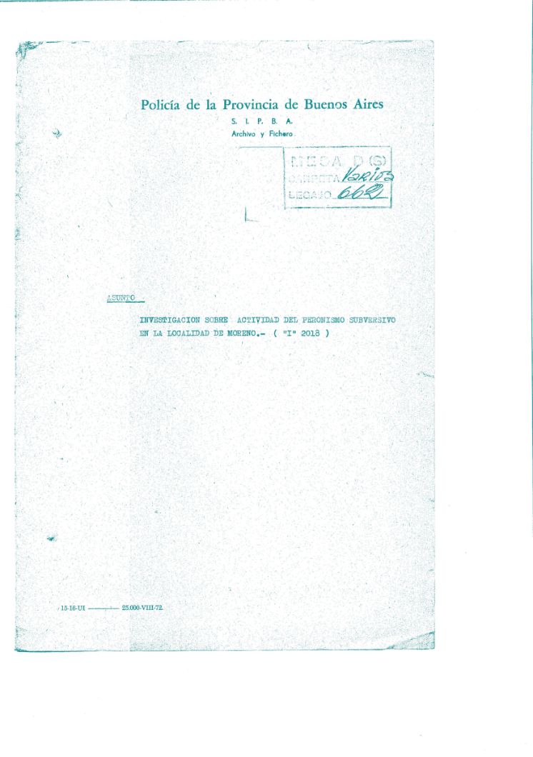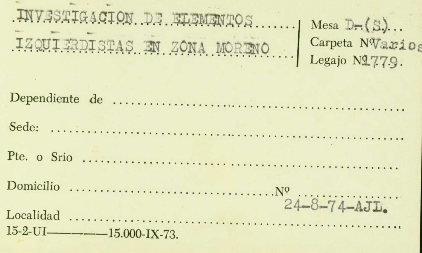 Volante del Partido Justicialista de Moreno. CPM- Fondo DIPPBA- Div. Cen. AyF, Mesa A, Serie Registro de antecedentes comuna, legajo 75. Tomo 1.