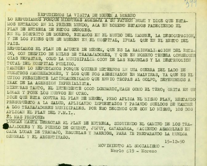 Volante del Movimiento al Socialismo de Moreno repudiando la visita del presidente Menem a la localidad de Moreno. CPM- Fondo DIPPBA- Div. Cen. AyF, Mesa A, Serie Registro de antecedentes comuna, legajo 75. Tomo 1.