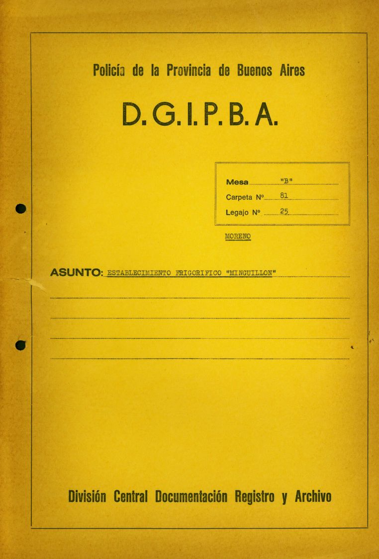 Carátula de legajo sobre el frigorífico Minguillón. CPM- Fondo DIPPBA- Div. Cen. AyF, Mesa B, carpeta 81, Legajo 25.