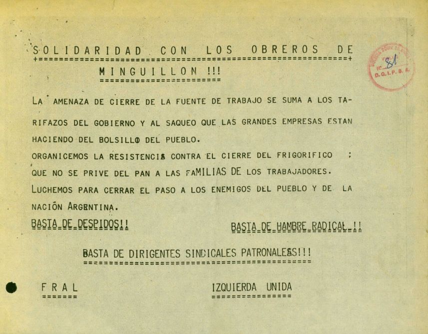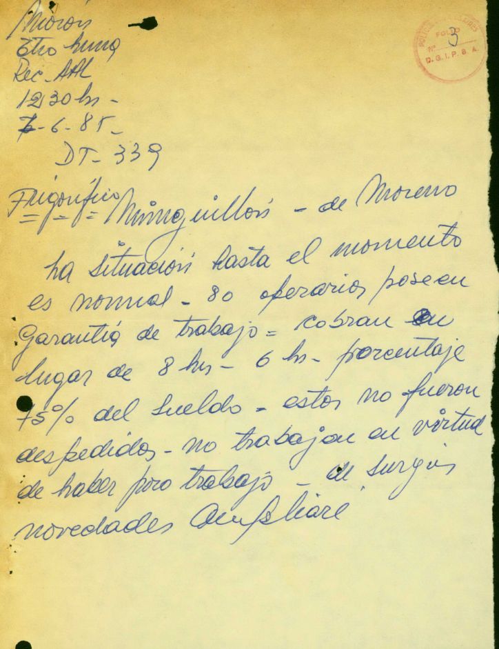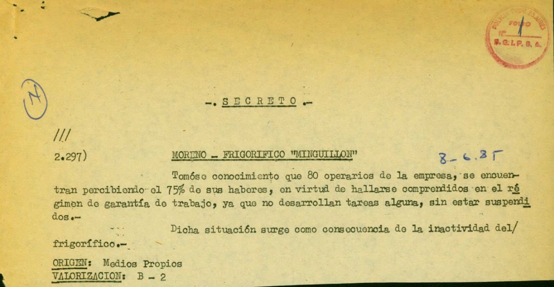 Informe de inteligencia de legajo Mesa B sobre la situación de los empleados del frigorífico Minguillón. CPM- Fondo DIPPBA- Div. Cen. AyF, Mesa B, carpeta 81, Legajo 25. Año 1985.
