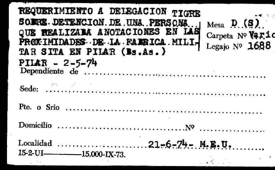 En algunos casos, los legajos a los que hacen referencia las fichas son Solicitudes de paradero, que dan cuenta de la búsqueda de los familiares que pedían a las autoridades judiciales y/o del ejecutivo saber si sus seres queridos estaban detenidos. En otros, se trata de información recogida previamente por la Dirección de inteligencia y son reveladoras de la persecución que ya se ejercía sobre las víctimas.