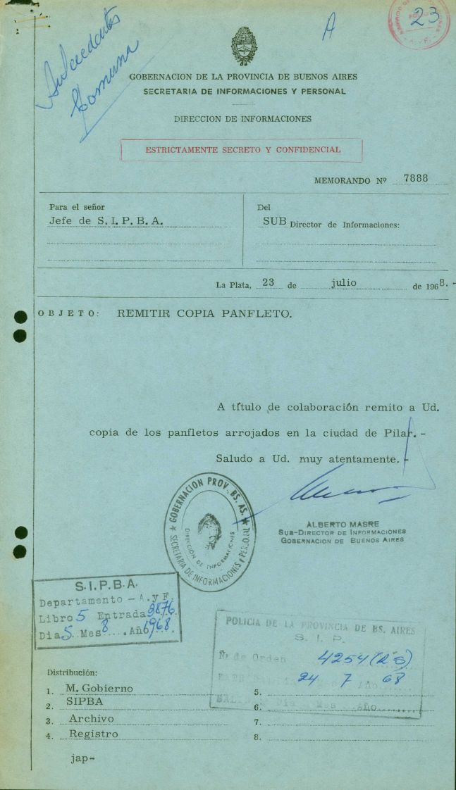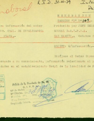“El postulado parte de la base de saber quién es quién, es decir, tener registrado a los buenos para saber quiénes son cuando dejan de serlo”. Esta frase extraída de un legajo de la Mesa Doctrina, da una idea de la persecución, espionaje y registro de la DIPPBA sobre las actividades de las y los ciudadanos de la provincia de Buenos Aires a lo largo de casi 50 años. Solicitudes, memos, informes, fotos, allanamientos, fueron parte de la burocracia de la inteligencia policial que también supo formar parte del engranaje del terrorismo de estado durante la última dictadura militar.