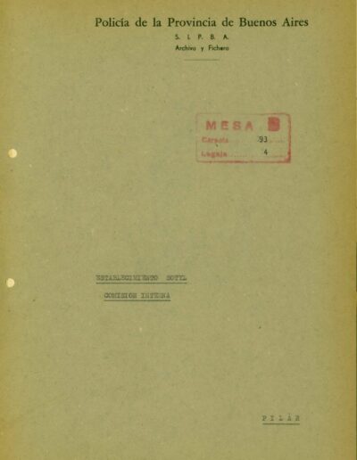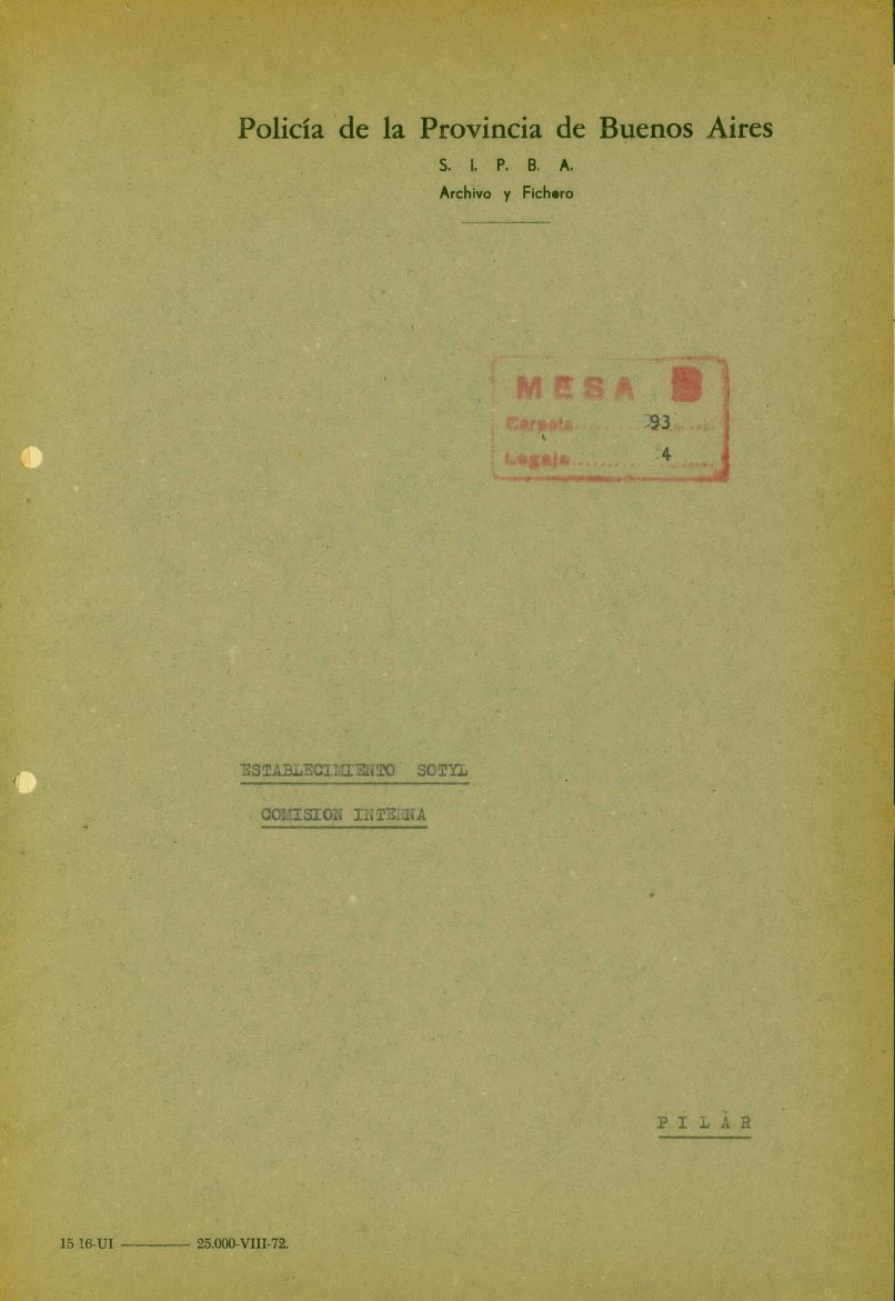Carátula del legajo de la Comisión Interna del Establecimiento Sotyl. CPM- Fondo DIPPBA- Div. Cen. AyF, Mesa B, carpeta 93, legajo 4.