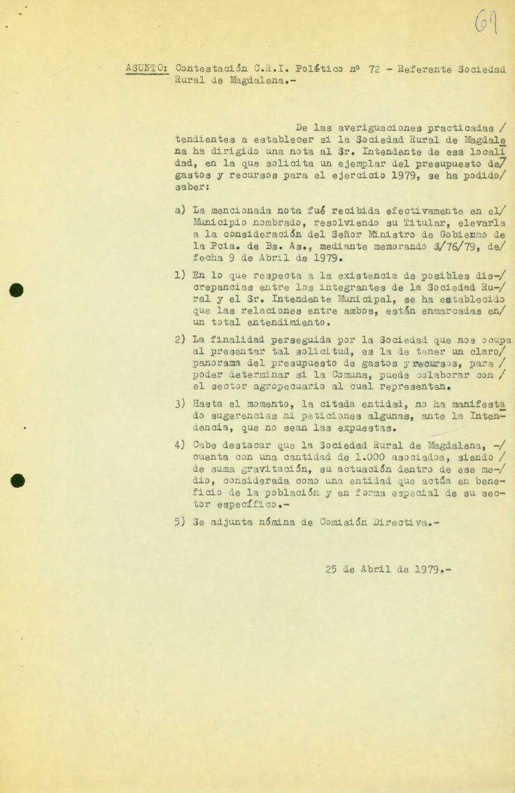Carátula del legajo de la Sociedad Rural de Magdalena. CPM- Fondo DIPPBA – Div. Cen. AyF, Mesa B, Carpeta 75, Legajo 1. Fechas extremas del legajo: 1953 - 1979