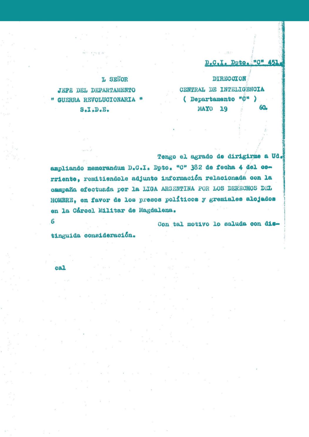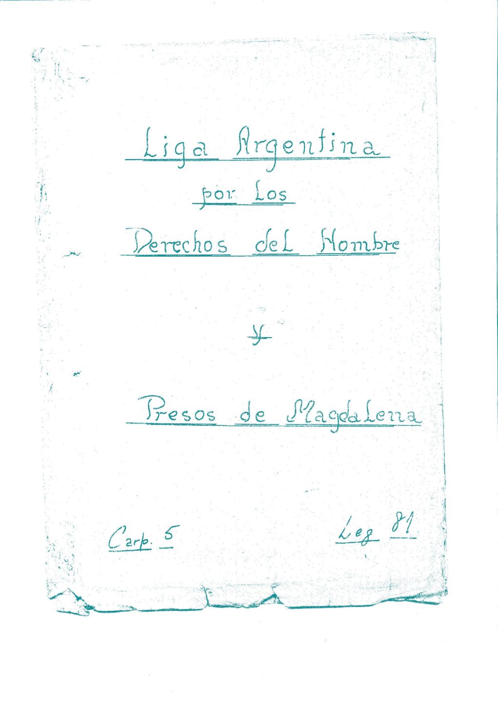 Carátula del legajo sobre la Liga Argentina por los derechos del hombre, en la que se intenta averiguar su actuación con presos políticos de Magdalena. CPM- Fondo DIPPBA – Div. Cen. AyF, Mesa C, carpeta 5, Legajo 81. Año 1960.