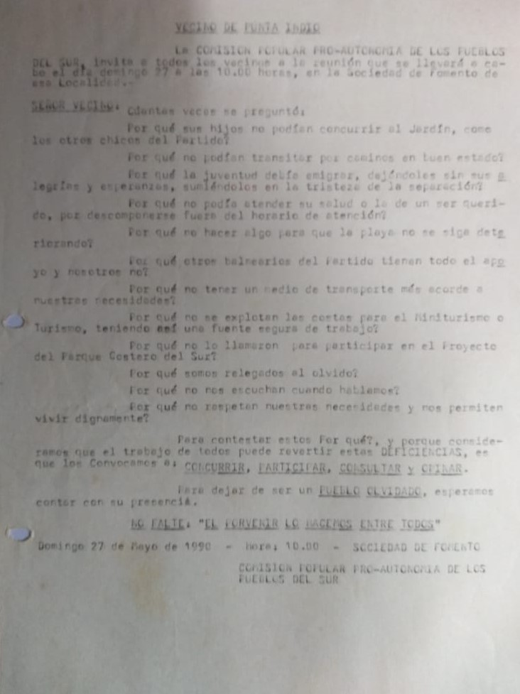 Volante del Movimiento de Jóvenes por la Autonomía de Punta Indio. CPM- Fondo DIPPBA – Div. Cen. AyF, Mesa A, Antecedentes comuna, Legajo 72, Tomo 1. Año 1994.