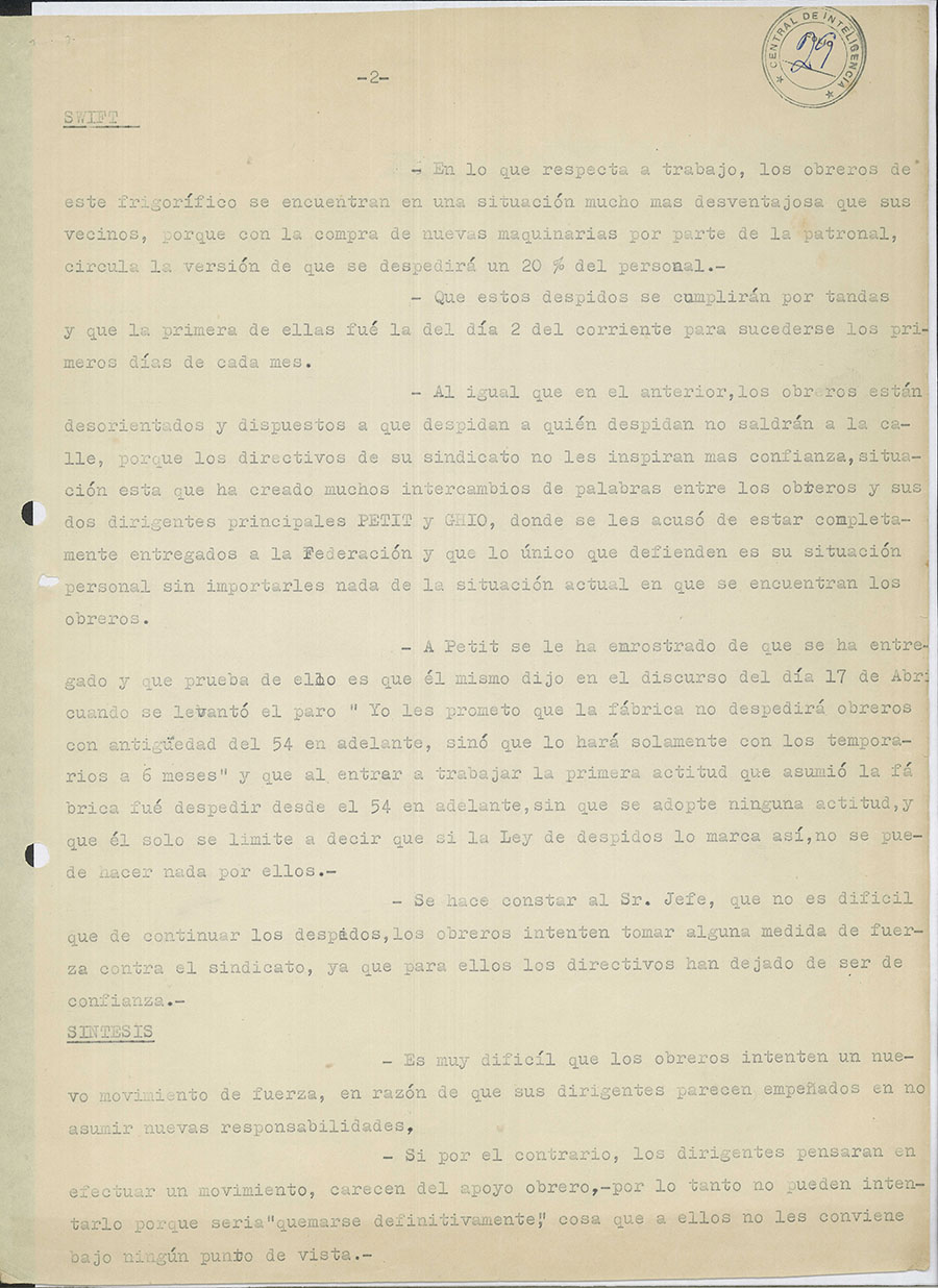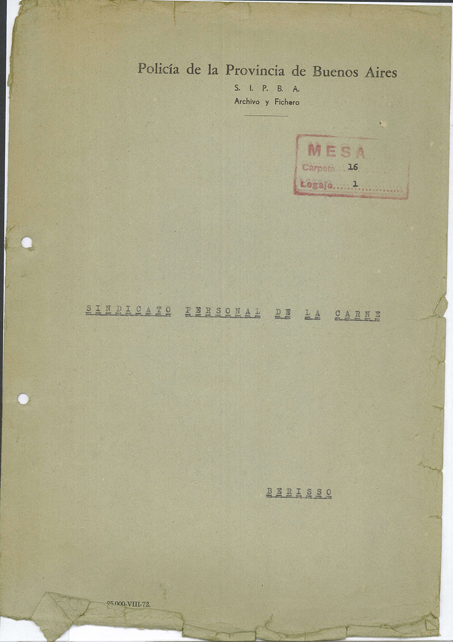 Todos los documentos que a continuación se presentan forman parte del legajo Mesa B Nº1 de la localidad de Berisso, denominado: “Sindicato personas de la carne”. El legajo comienza con un documento de 1953 y finaliza con otro de 1979; hemos seleccionado en particular documentos sobre distintas medidas de fuerza ante despidos, encabezadas por trabajadores y trabajadoras de los frigoríficos Armour y Swift durante los primeros años de la década de los ‘60.