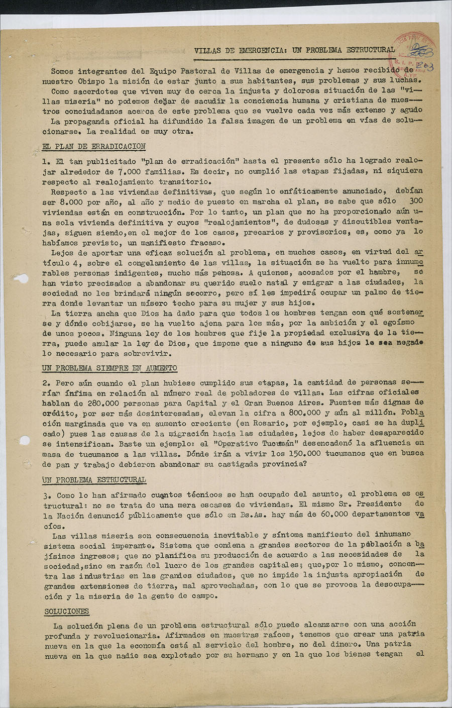 El legajo cuenta con varios tomos, más de 100 fojas, y registra distintos aspectos de las “Villas de emergencia” de la provincia de Buenos Aires. El legajo se inicia en 1959 y finaliza en 1982.