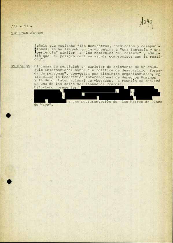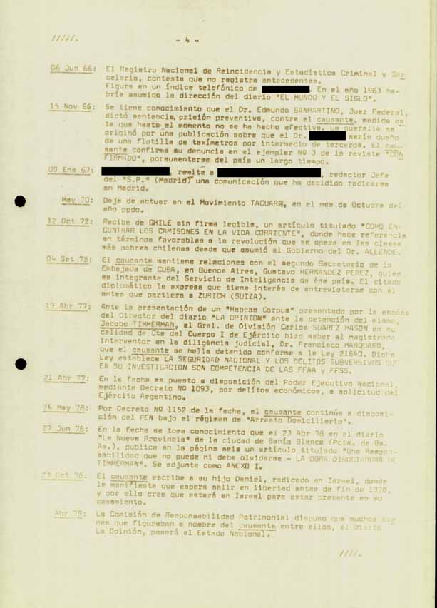 Encontramos aquí un riquísimo material que permite no sólo ver las apreciaciones de los distintos servicios de inteligencia acerca de "el causante", en este caso Jacobo Timerman, sino también los cruces o las influencias entre los informes elaborados por algunos de los servicios y algunos medios de prensa, estrechamente vinculados política e ideológicamente con la última dictadura militar como es el caso del periódico La Nueva Provincia de la ciudad de Bahía Blanca.