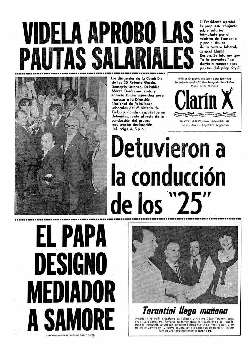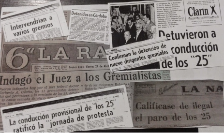 En este contexto caracterizado por la quiebra del sector fabril, la inestabilidad de los salarios y el deterioro de las condiciones de vida de los trabajadores, la Comisión de los 25 llama a la primera huelga general para el 27 de abril de 1979[1], a pesar de no tener una representación gremial legalmente reconocida. La Junta Militar reacciona inmediatamente y encarcela a todos los dirigentes. A pesar de ello, el acatamiento a la huelga fue altísimo, estimado por los gremios convocantes en un 75%. Pasarán unos años más hasta que el pueblo vuelva a salir ampliamente a las calles.