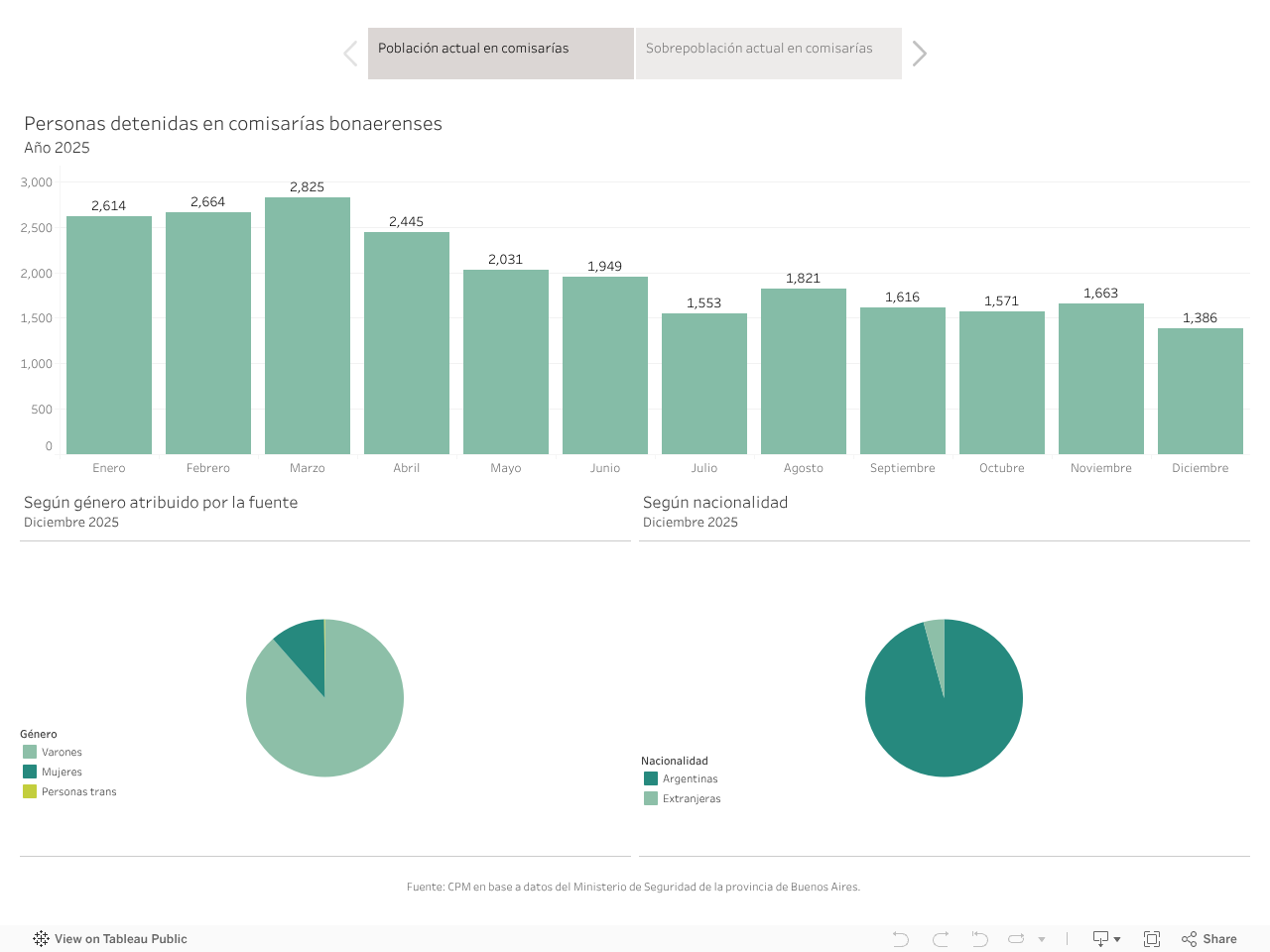 Esta sección contiene datos sobre la población detenida en las comisarías a cargo de la Policía Bonaerense, perteneciente al Ministerio de Seguridad de la provincia de Buenos Aires. La información se desagrega por género, edad y nacionalidad. A su vez, se presentan datos que dan cuenta de las condiciones de encierro, como la sobrepoblación y las clausuras de las dependencias policiales, y acerca de las muertes ocurridas bajo custodia policial según causa de muerte, género, edad y lugar de muerte. Aquí se puede descargar la base abierta del Registro CPM de muertes en comisarías.
